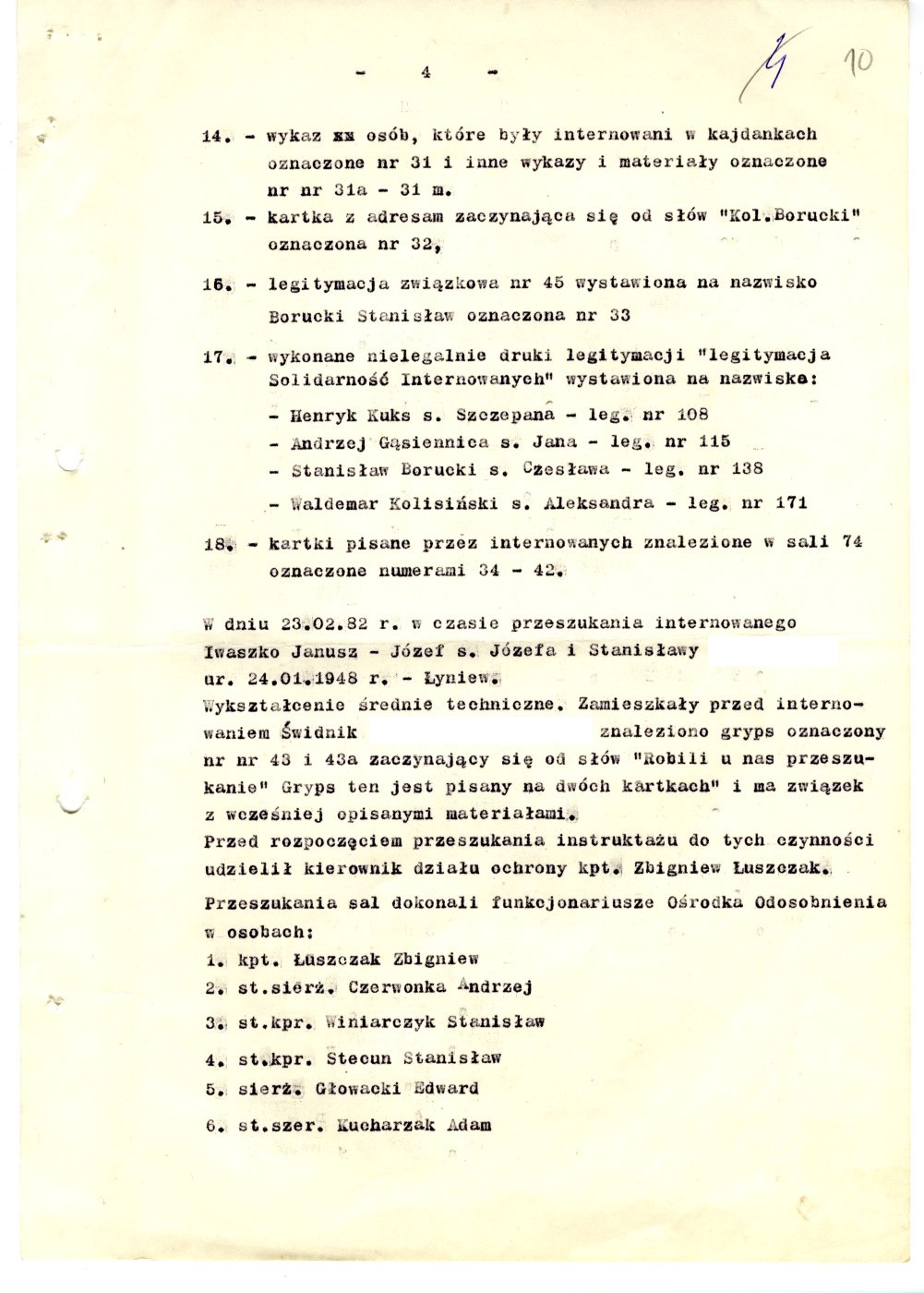 Zakład Karny Włodawa do Prokuratora Wojewódzkiego w Chełmie 27.02.1982 r. informuje o rewizji i odnalezieniu nielegalnych przedmiotów u internowanych (k. 7-11)