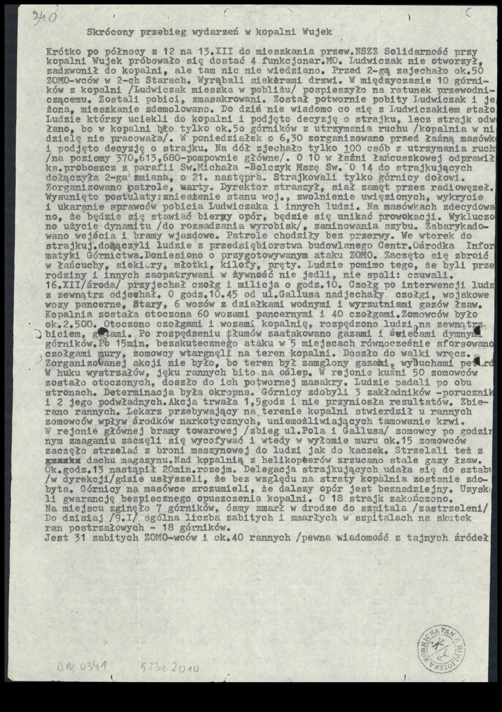 Skrócony przebieg wydarzeń w kopalni „Wujek” najprawdopodobniej ze stycznia 1982 r.