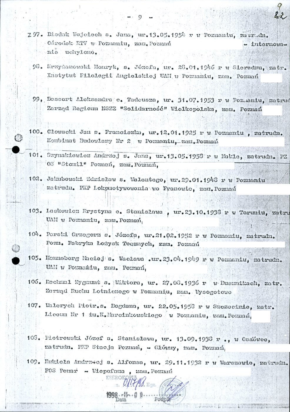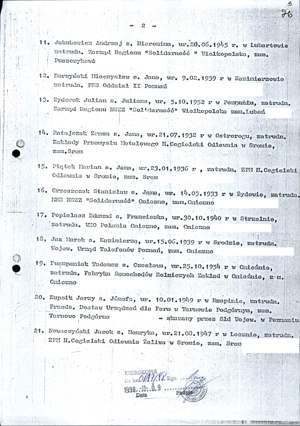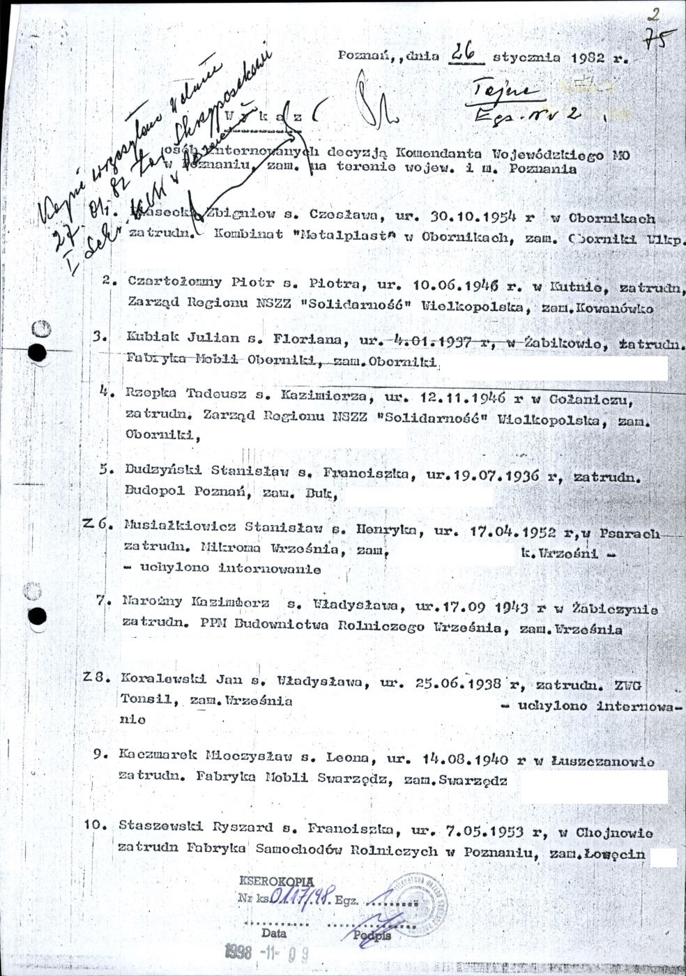 Kserokopia wykazu osób internowanych decyzją komendanta wojewódzkiego MO w Poznaniu, zamieszkałych na terenie województwa poznańskiego i miasta Poznania z dnia 26 stycznia 1982 r.