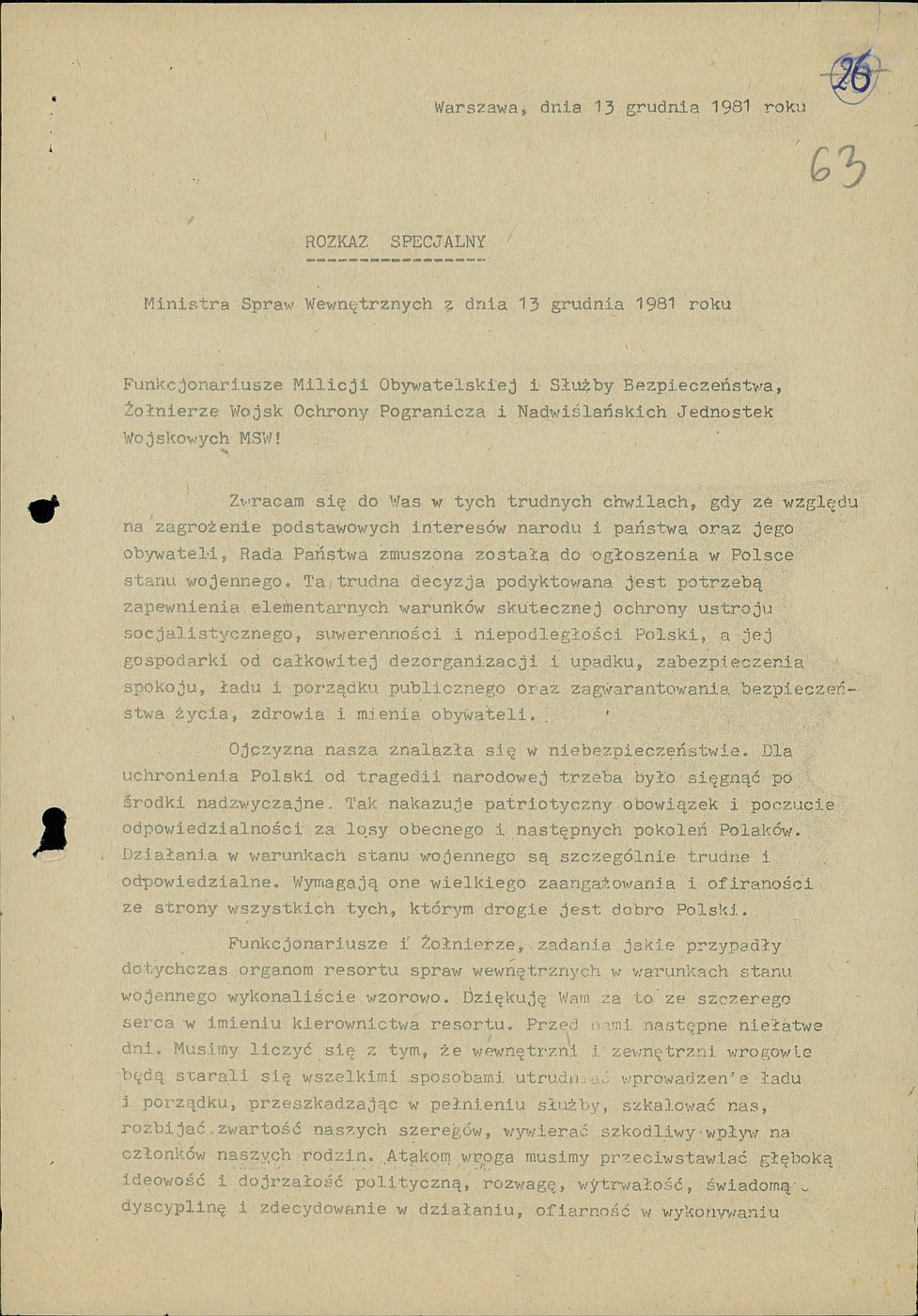 IPN BU 00735/1187 Rozkaz specjalny Ministra Spraw Wewnętrznych z dnia 13.12.1981 r. Rozkaz specjalny Ministra Spraw Wewnętrznych z dnia 13.12.1981 r.