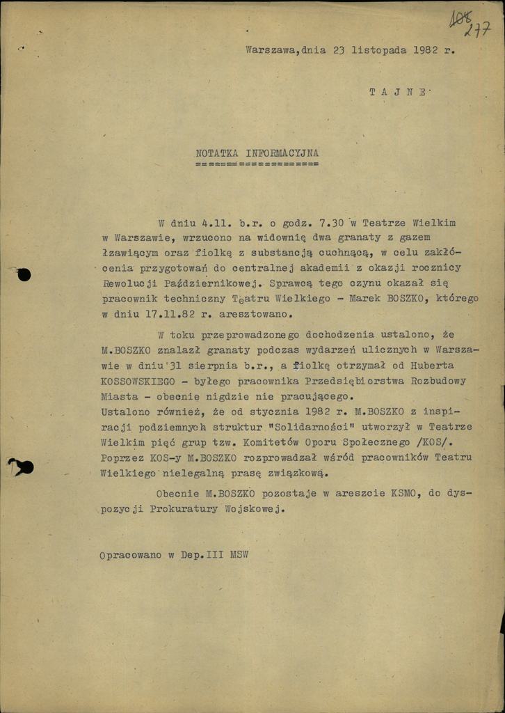 Notatka informacyjna o incydencie w Teatrze Wielkim - granat z gazem łzawiącym 23.11.1982