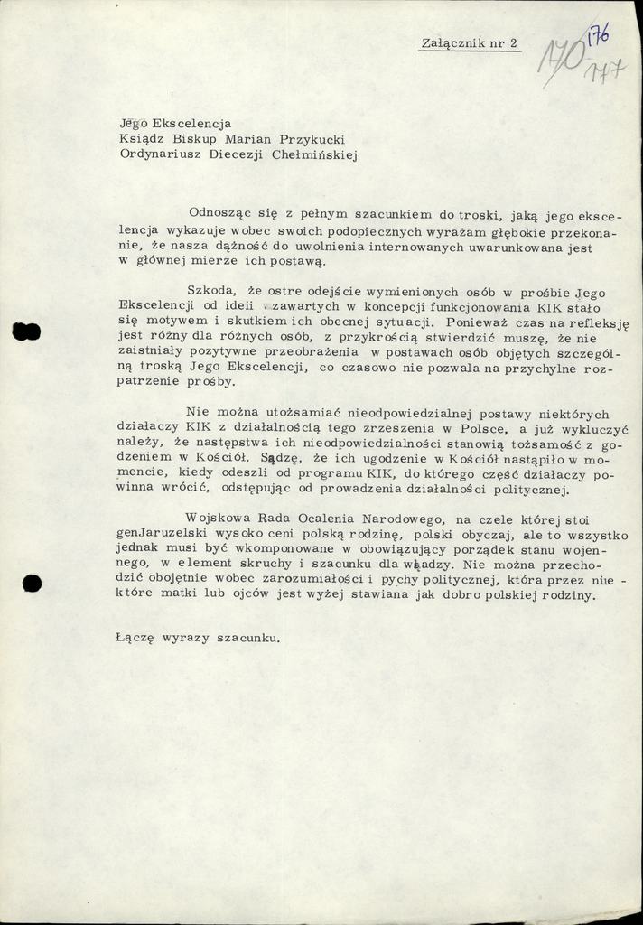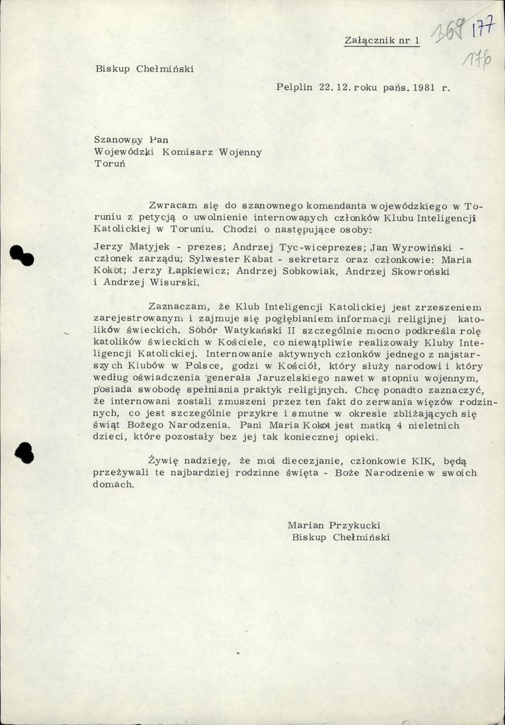 Pismo i odpowiedz na pismo bp. Chełmińskiego 22.12.1981