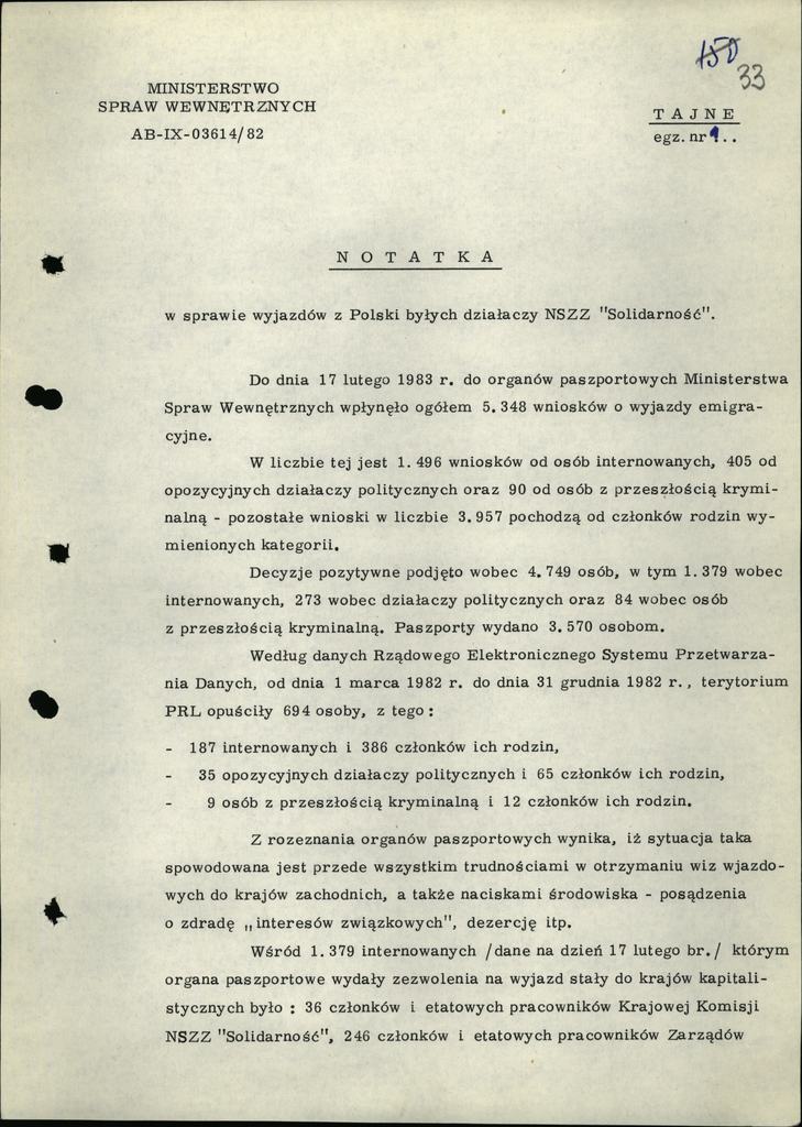 Notatka w sprawie wyjazdów z Polski byłych działaczy NSZZ "S"