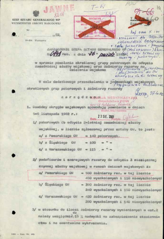 Zarządzenie szefa Sztabu Generalnego Wojska Polskiego nr 0141 Mob. z dnia 26 października 1982 r.