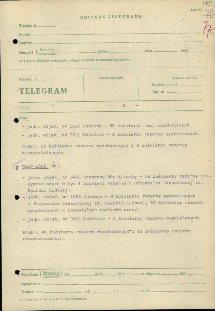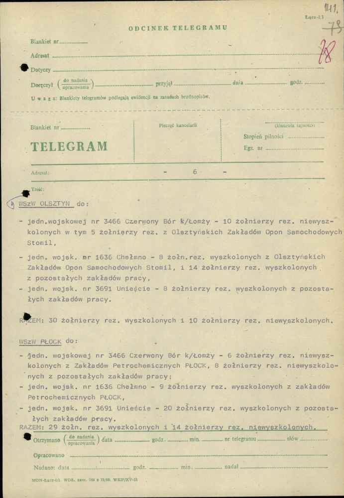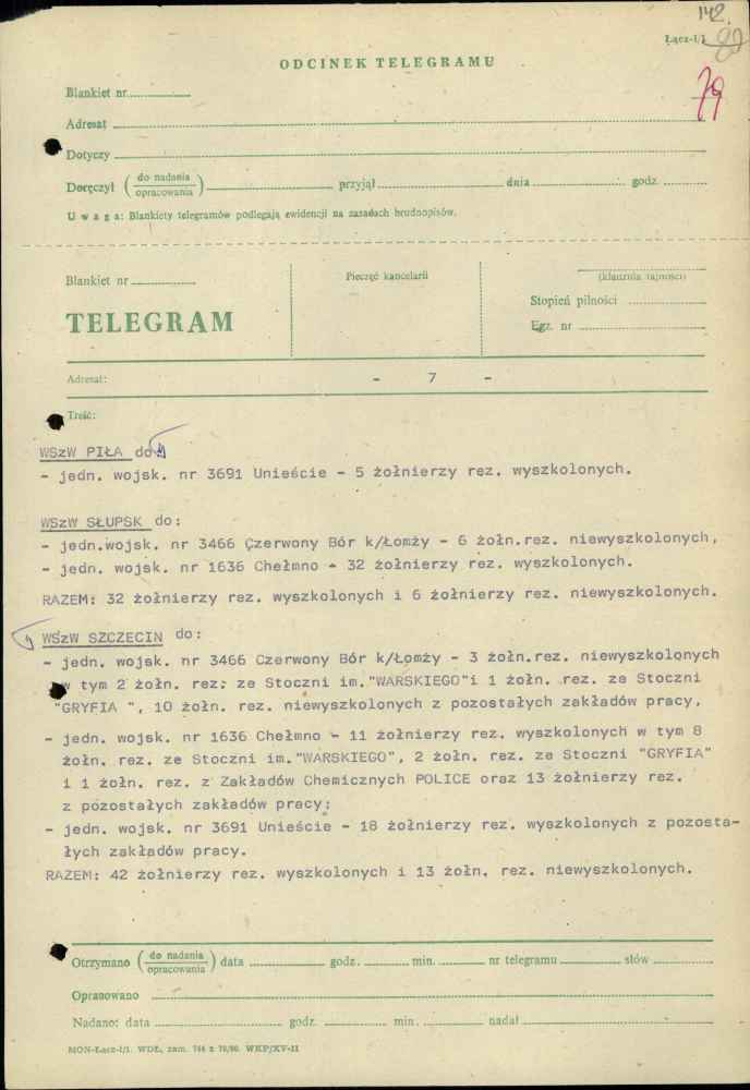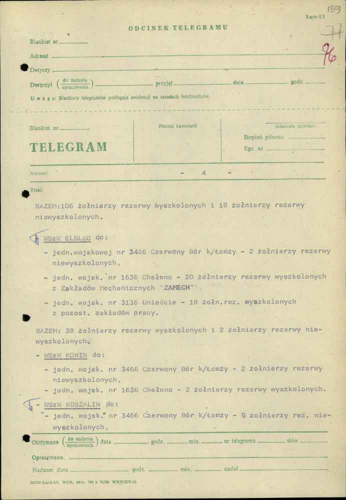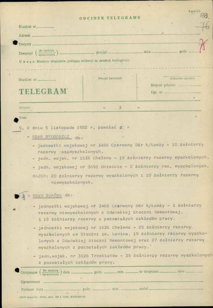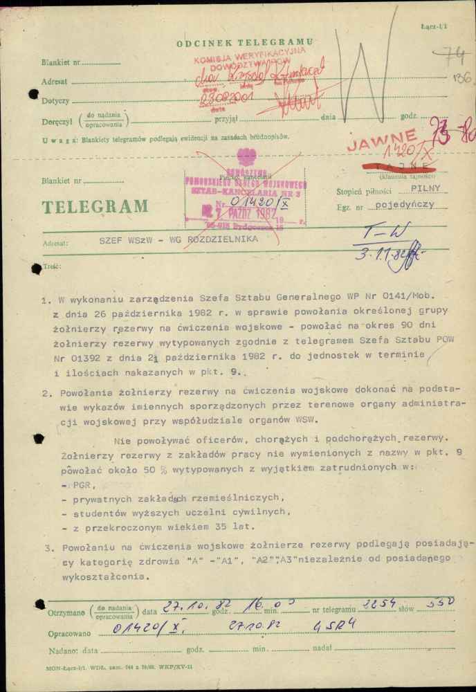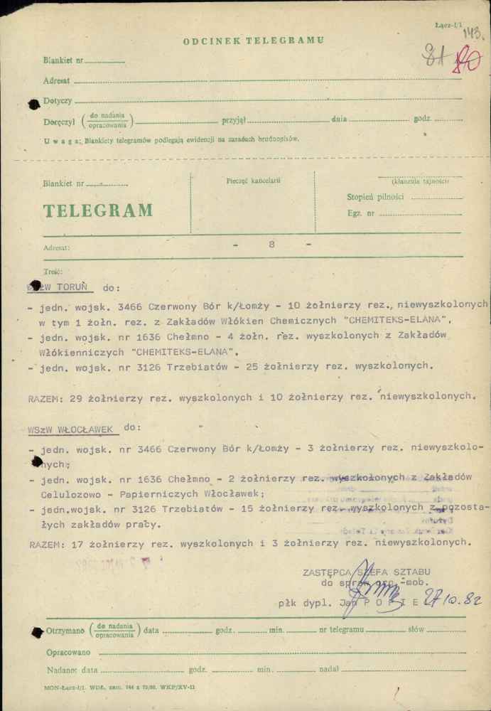Telegram zastępcy szefa sztabu Pomorskiego Okręgu Wojskowego ds. organizacyjno-mobilizacyjnych plk. Jana Popiela z dnia 27 października 1982 r.