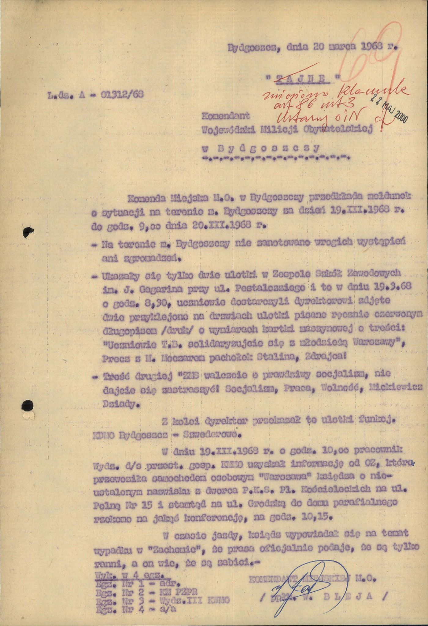 - k. 69 – Pismo komendanta miejskiego MO w Bydgoszczy dot. sytuacji w mieście w dniach 19-20 III 1968 r., 20 III 1968 r.