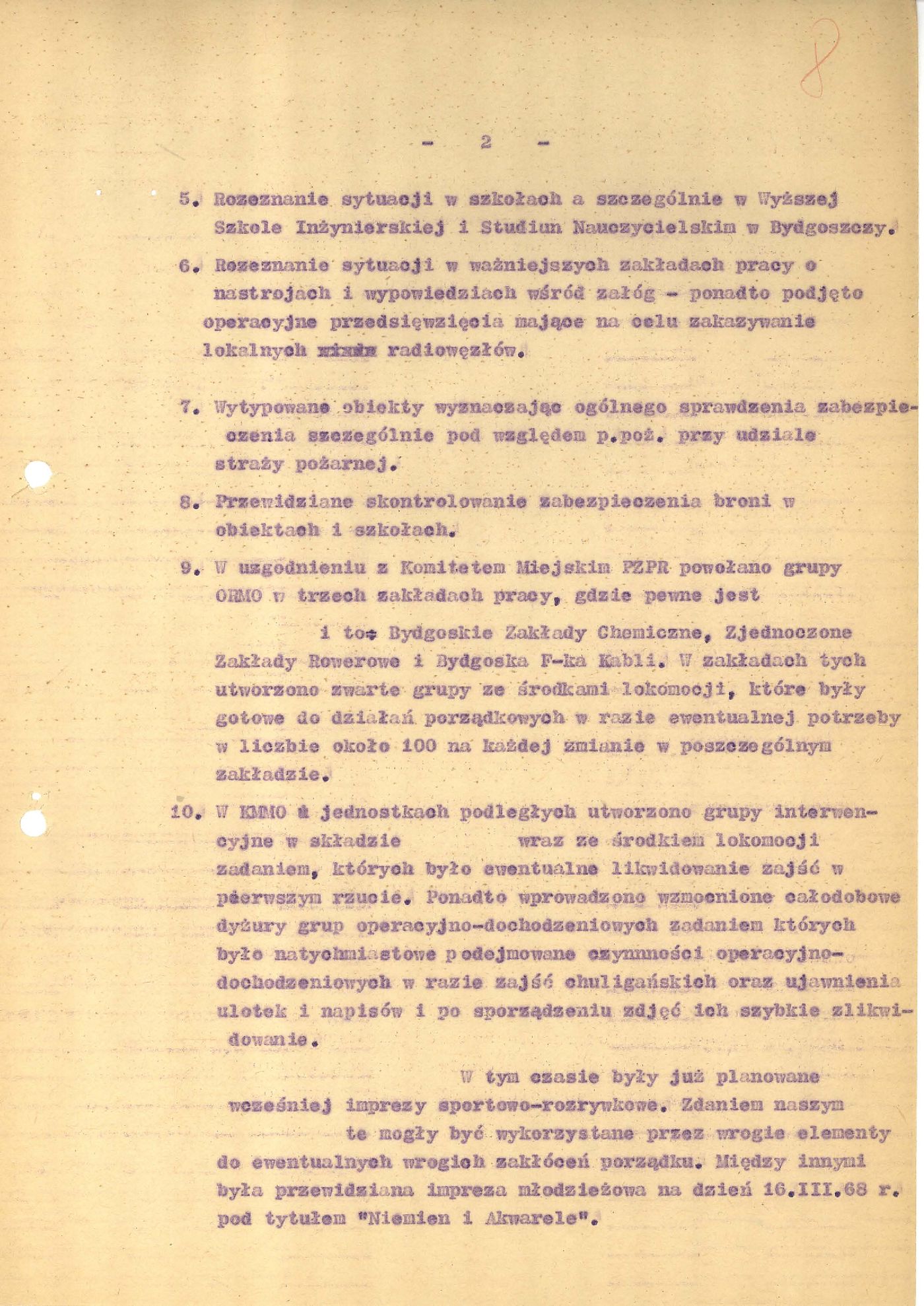 - k. 21-36 – Plan zabezpieczenia miasta Bydgoszczy w związku z zajściami na terenie miasta Warszawy i innych miast Polski, 14 III 1968 r.; Uzupełnienie do planu zabezpieczenia ładu i porządku na terenie m. Bydgoszczy z dnia 14 III 1968 r., 19 III 1968 r.