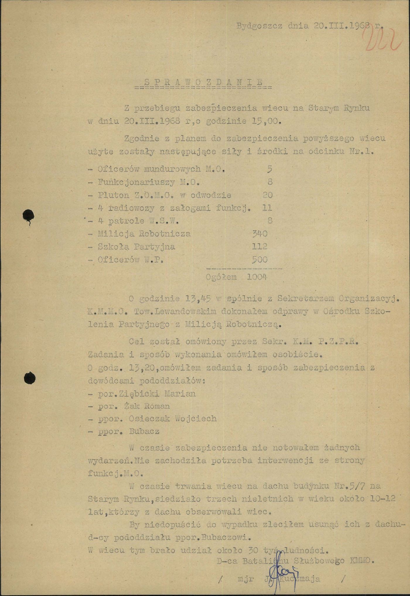 - k. 222 – Sprawozdanie z przebiegu zabezpieczenia wiecu na Starym Rynku w dniu 20 III 1968 r. o godzinie 15.00, 20 III 1968 r.