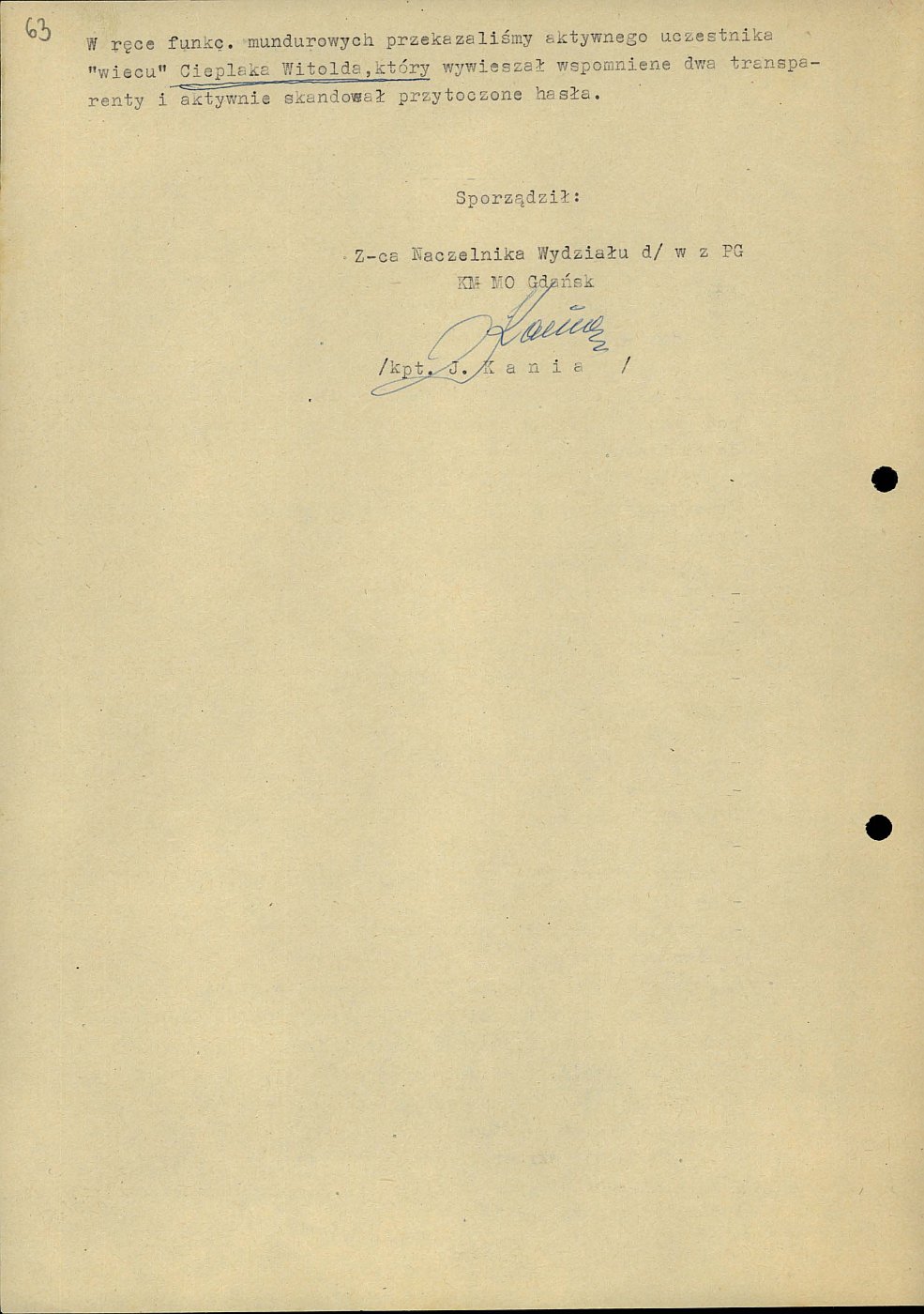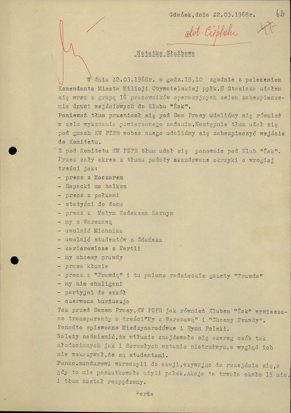 zastępcy naczelnika Wydziału do Walki z Przestępstwami Gospodarczymi KM MO w Gdańsku kpt. Jerzego Kani z 12 marca 1968 r. dotycząca sytuacji pod klubem studenckim „Żak”, gdzie doszło do pierwszych demonstracji i zamieszek ulicznych w Trójmieście. Ze zbiorów AIPN Gd (sygn. IPN Gd 1020/1)