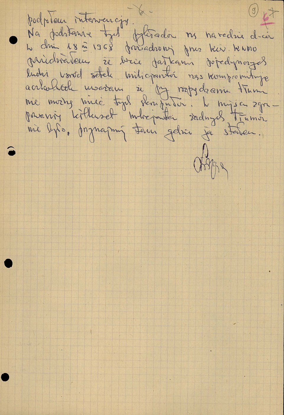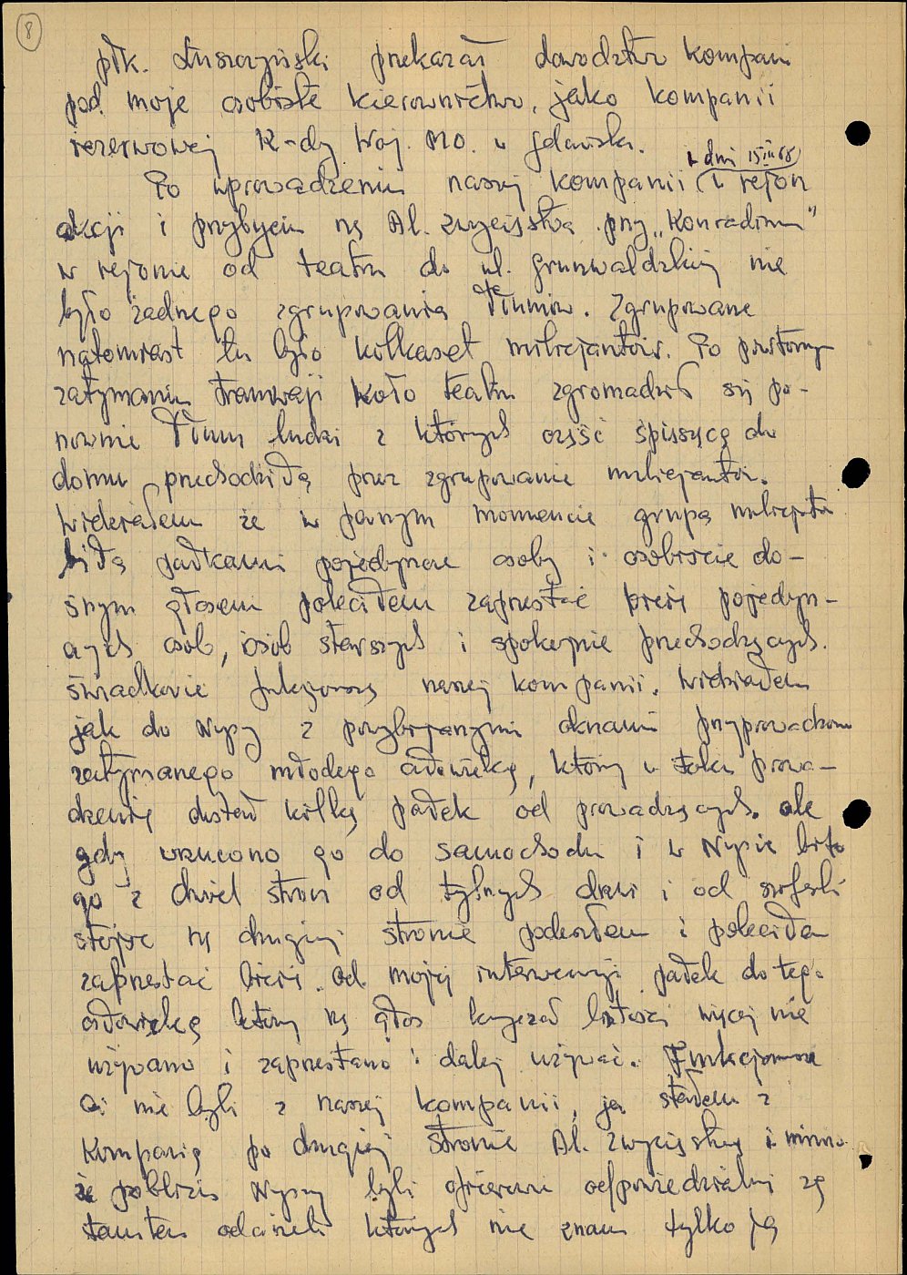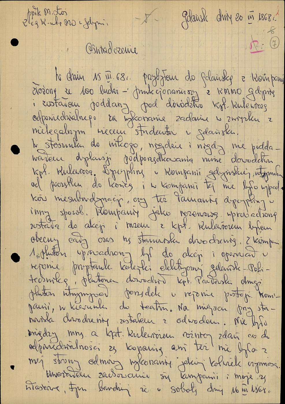 na temat jego zachowania w czasie tłumienia zamieszek 15 marca 1968 r. i używania siły wobec uczestników demonstracji, złożone 20 marca 1968 r. w związku z oskarżeniami o bierność. Ze zbiorów AIPN Gd (sygn. IPN Gd 032/723 t. 2)