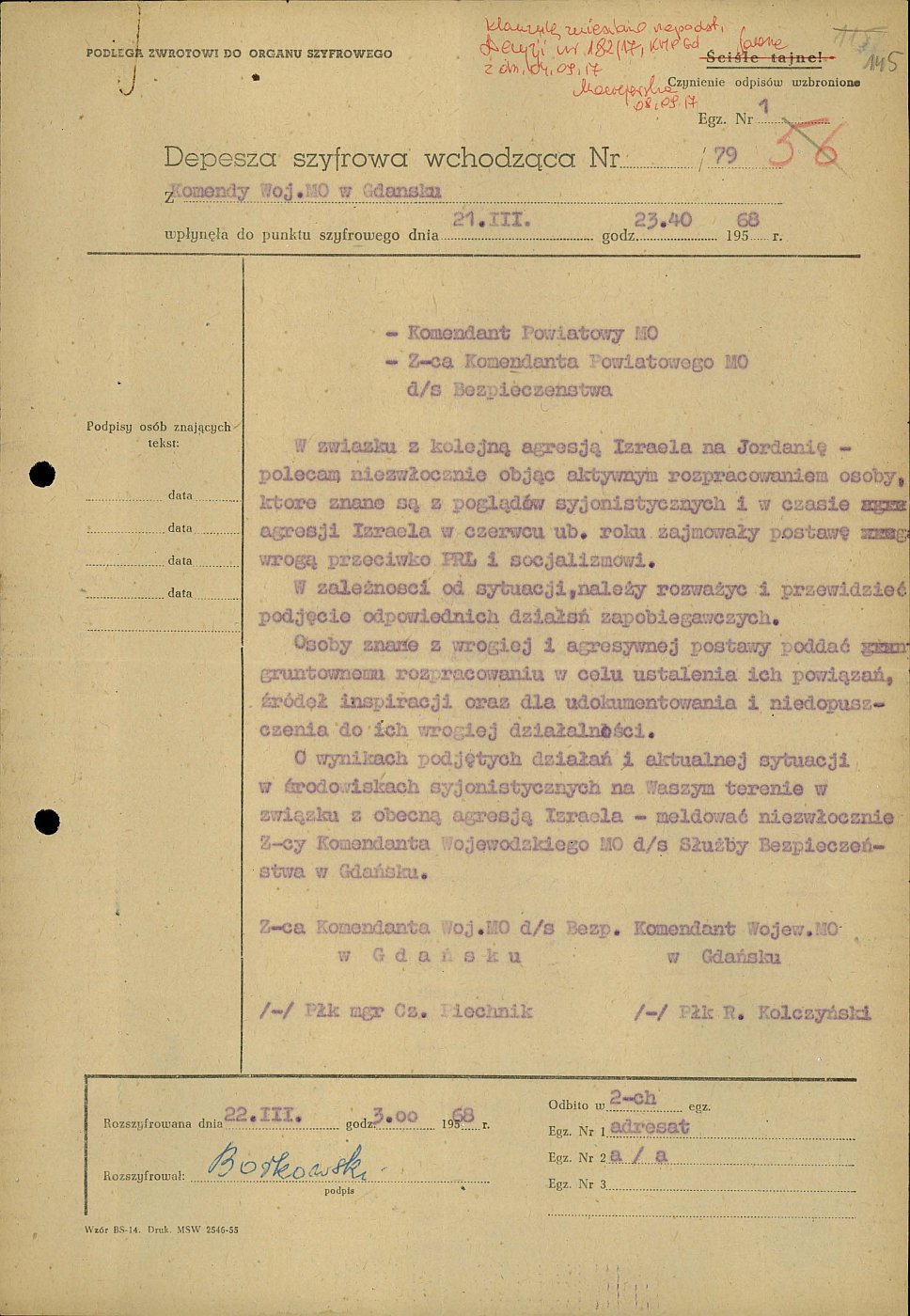 płk. Romana Kolczyńskiego i jego zastępcy ds. SB płk. Czesława Piechnika do komendantów powiatowych MO i ich zastępców z 21 marca 1968 r. nakazująca podjęcie rozpracowania "syjonistów". Ze zbiorów AIPN Gd (sygn. IPN Gd 1020/1)