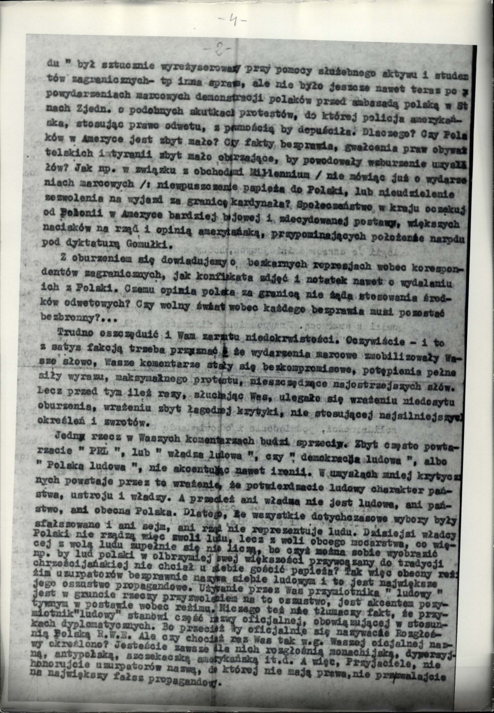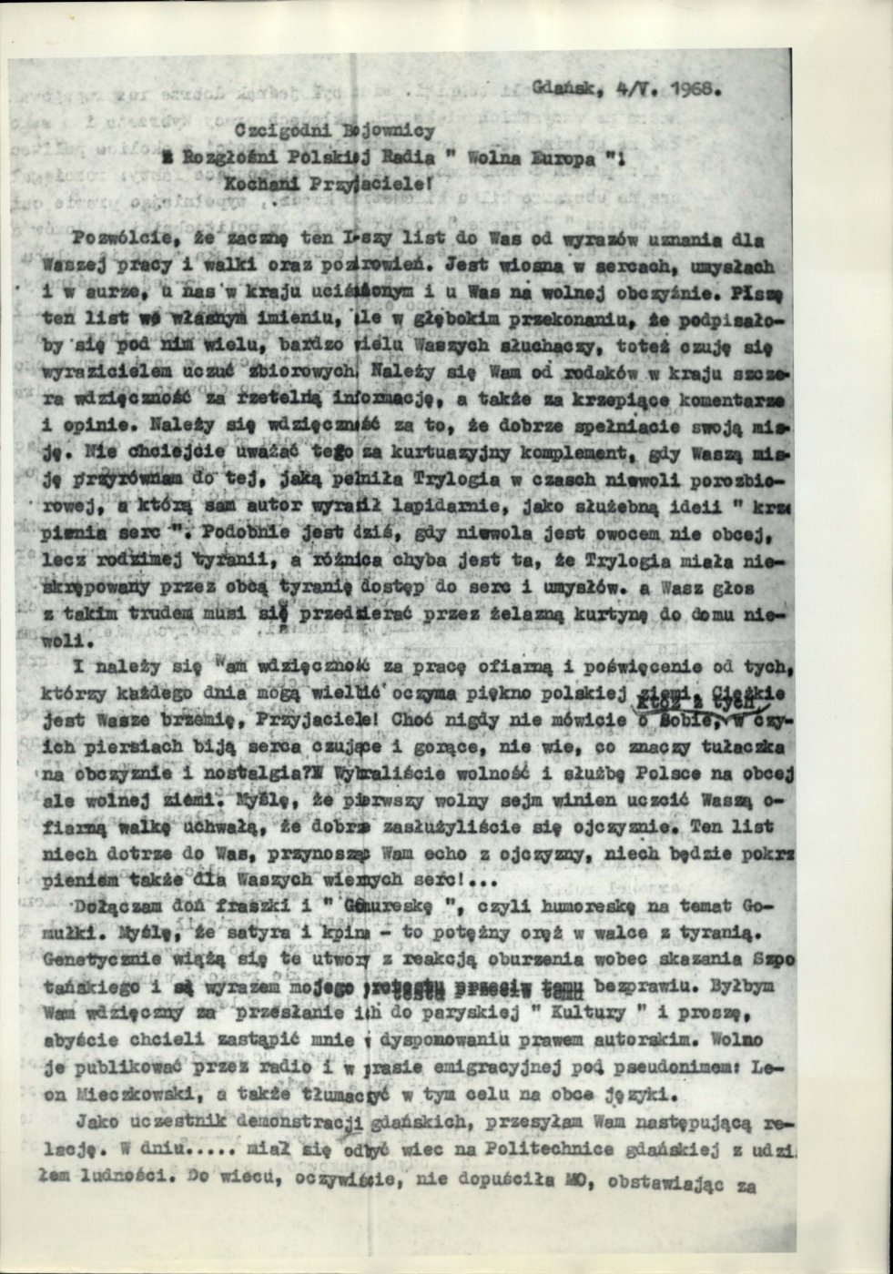 Fotokopia przechwyconego przez SB listu do Radia Wolna Europa z 4 maja 1968 r.