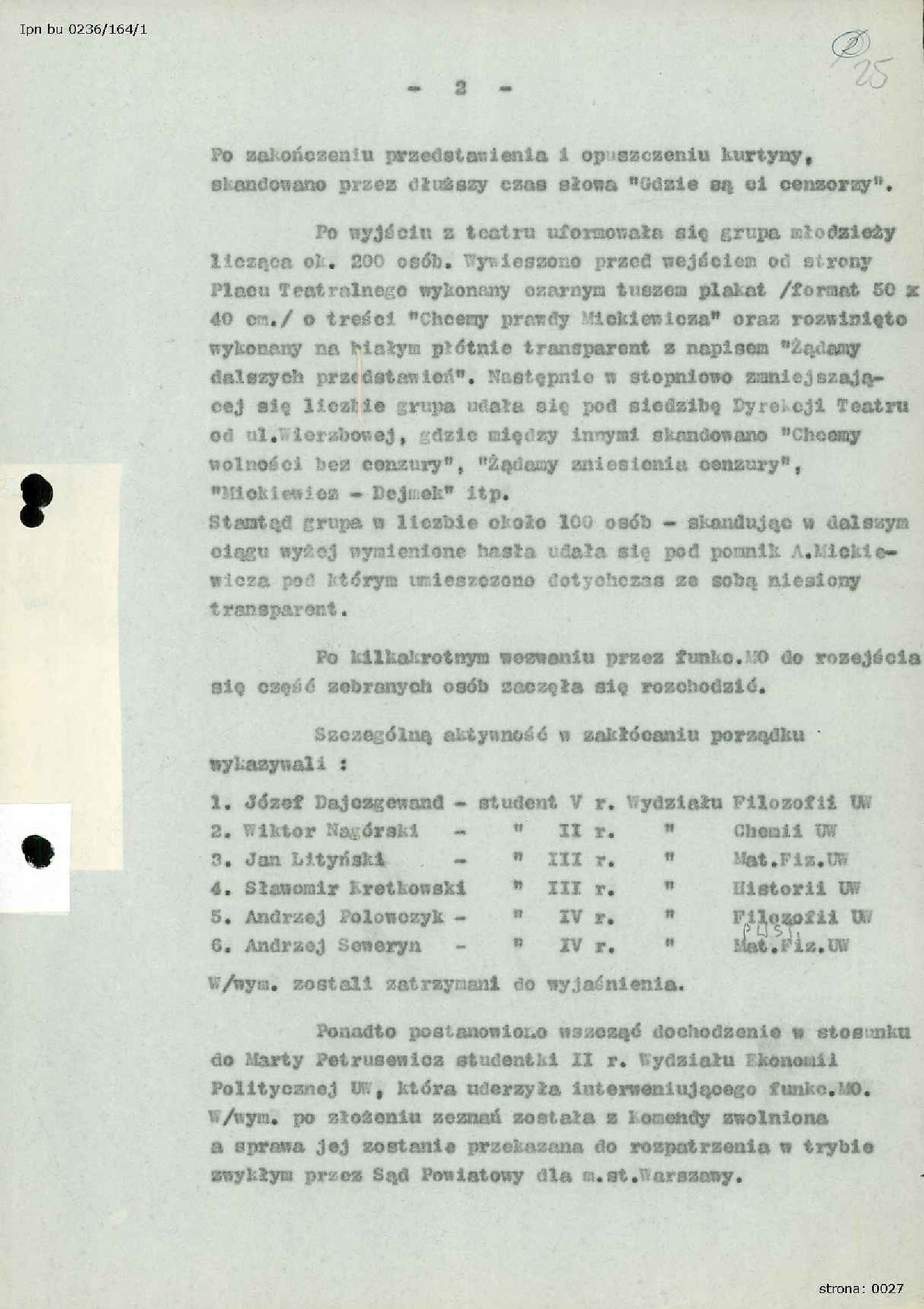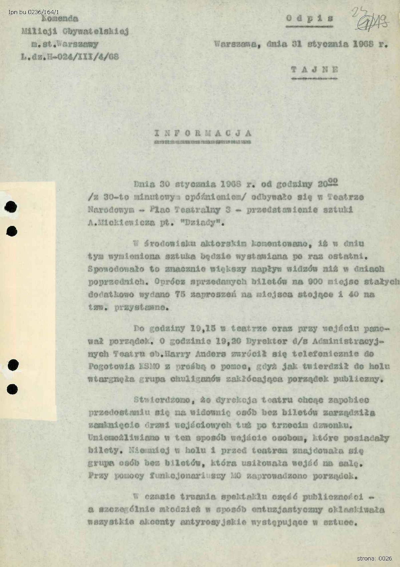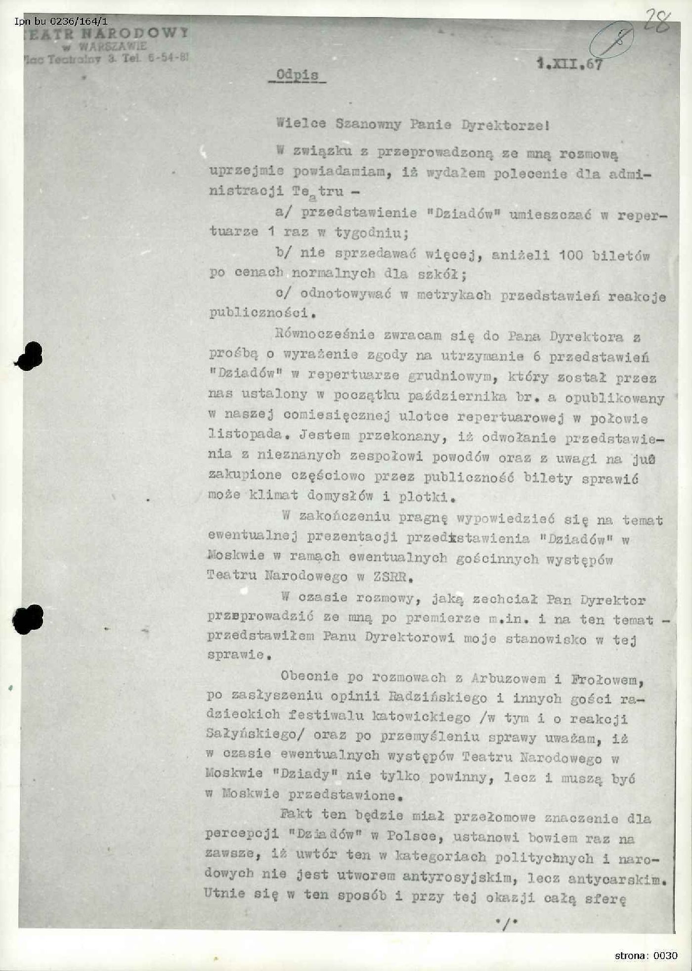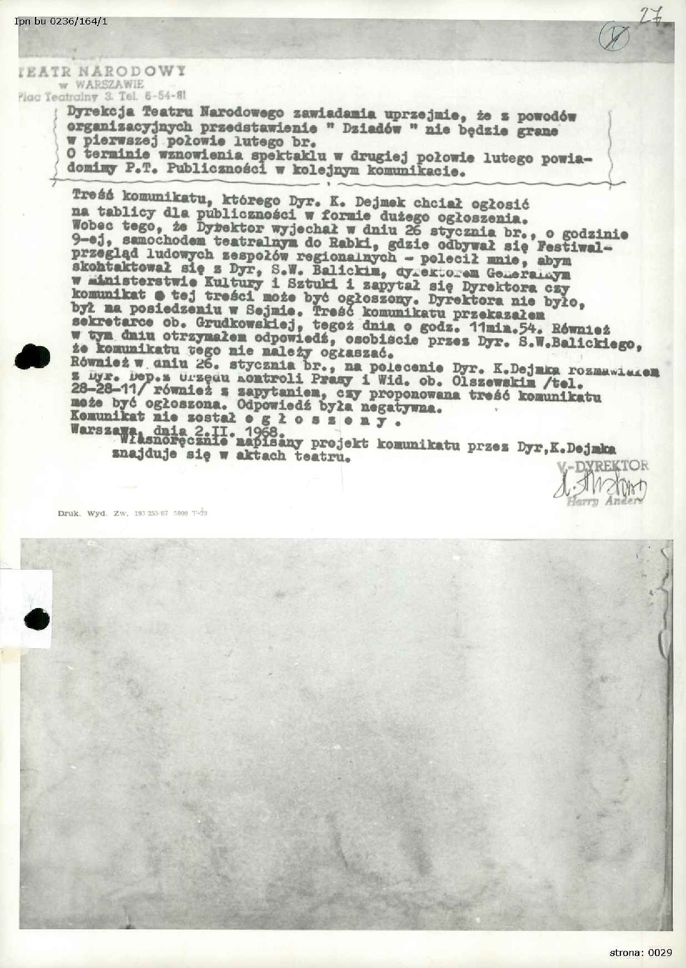 Informacja z dn. 31.01.1968 r. sporządzona przez I Zastępcę Komendanta Stołecznego MO ds. Służby Bezpieczeństwa w Warszawie, płk. Stanisława Sławińskiego dotycząca demonstracji studentów warszawskich po spektaklu „Dziady” w Teatrze Narodowym w dniu 30.01.1968 r., IPN BU 0236/164 t. 1, s. 24-26; Zawiadomienie Dyrekcji Teatru Narodowego w Warszawie o zawieszeniu przedstawień "Dziadów" w I połowie lutego 1968 r., IPN BU 0236/164 t. 1, s. 27; Odpis listu Dyrektora Teatru Narodowego, Kazimierza Dejmka do Generalnego Dyrektora Ministerstwa Kultury i Sztuki, Stanisława Witolda Balickiego z dn. 09.02.1968 r. odnośnie przedstawień "Dziadów", IPN BU 0236/164 t. 1, s. 28-29.
