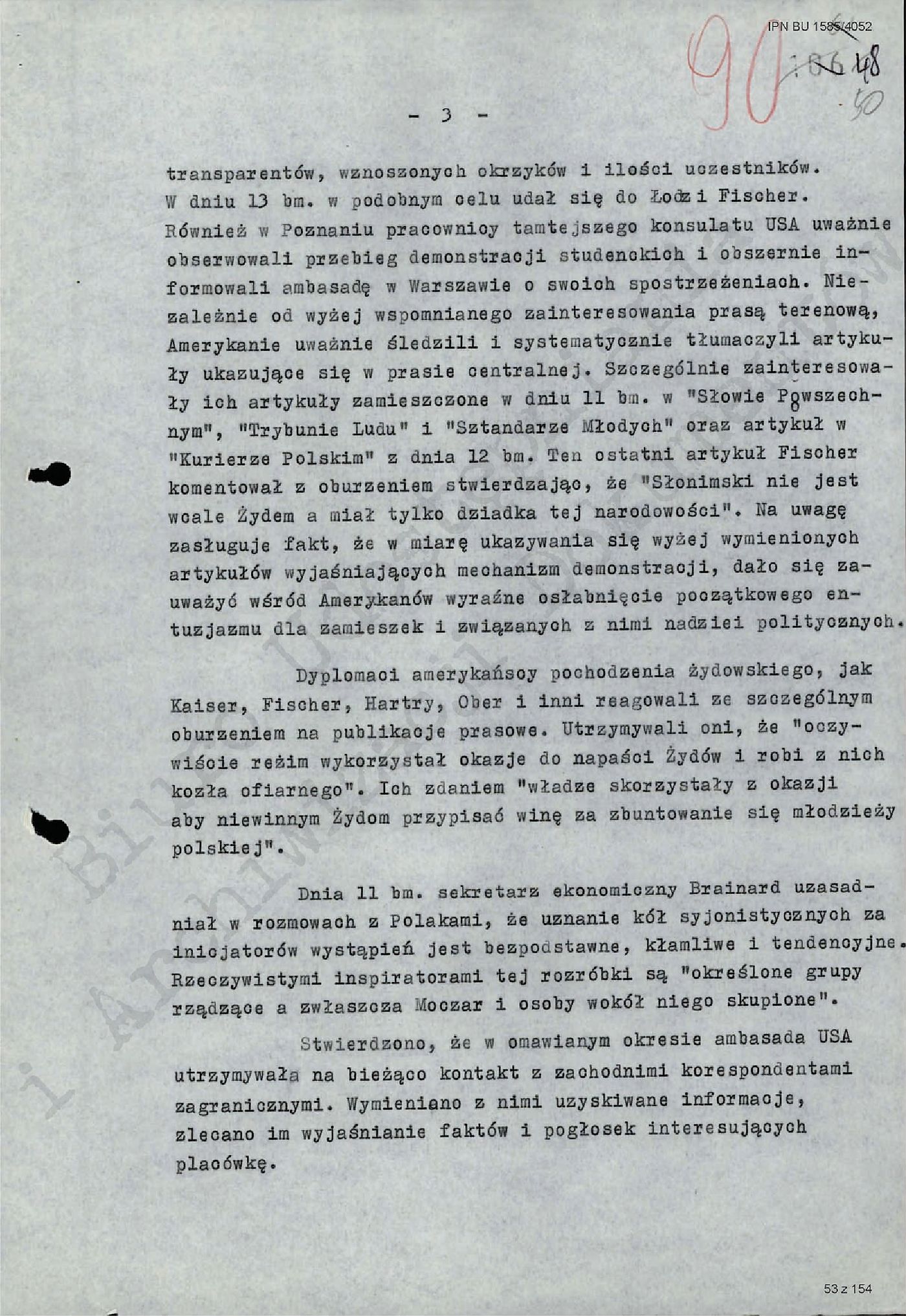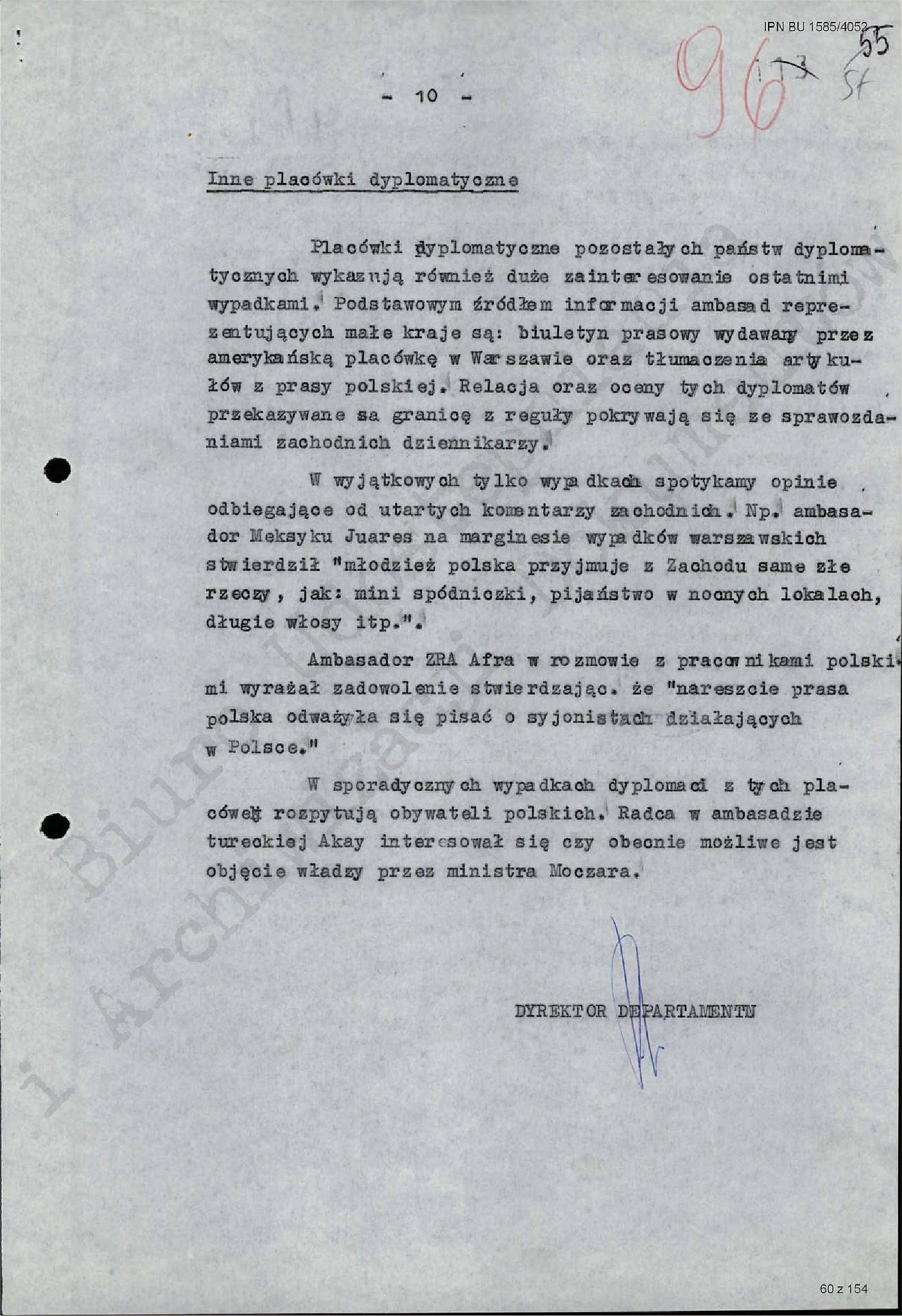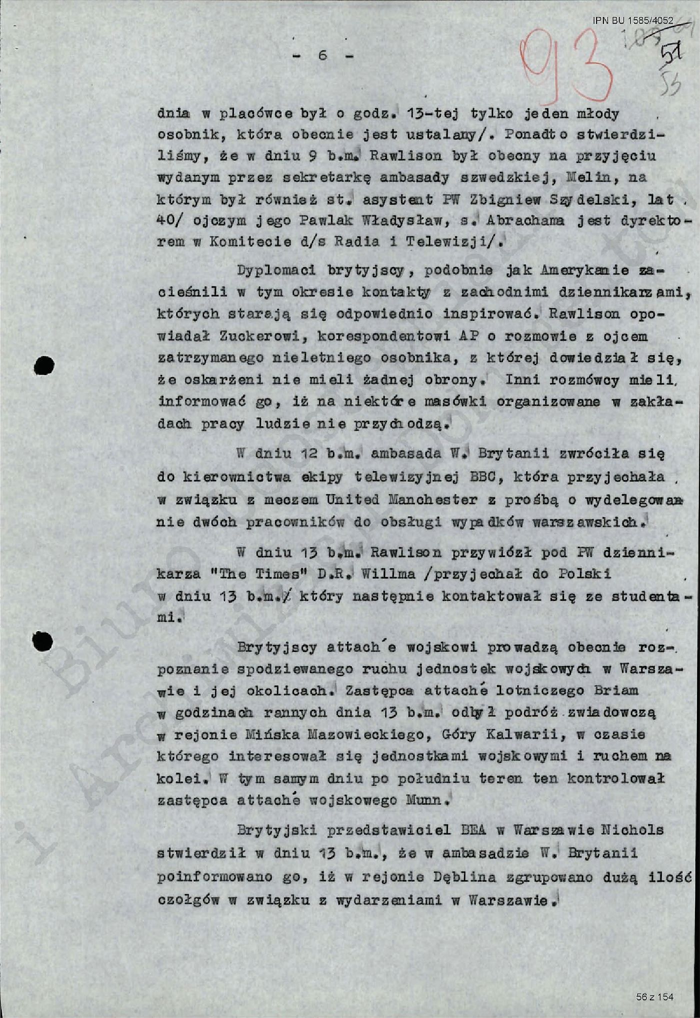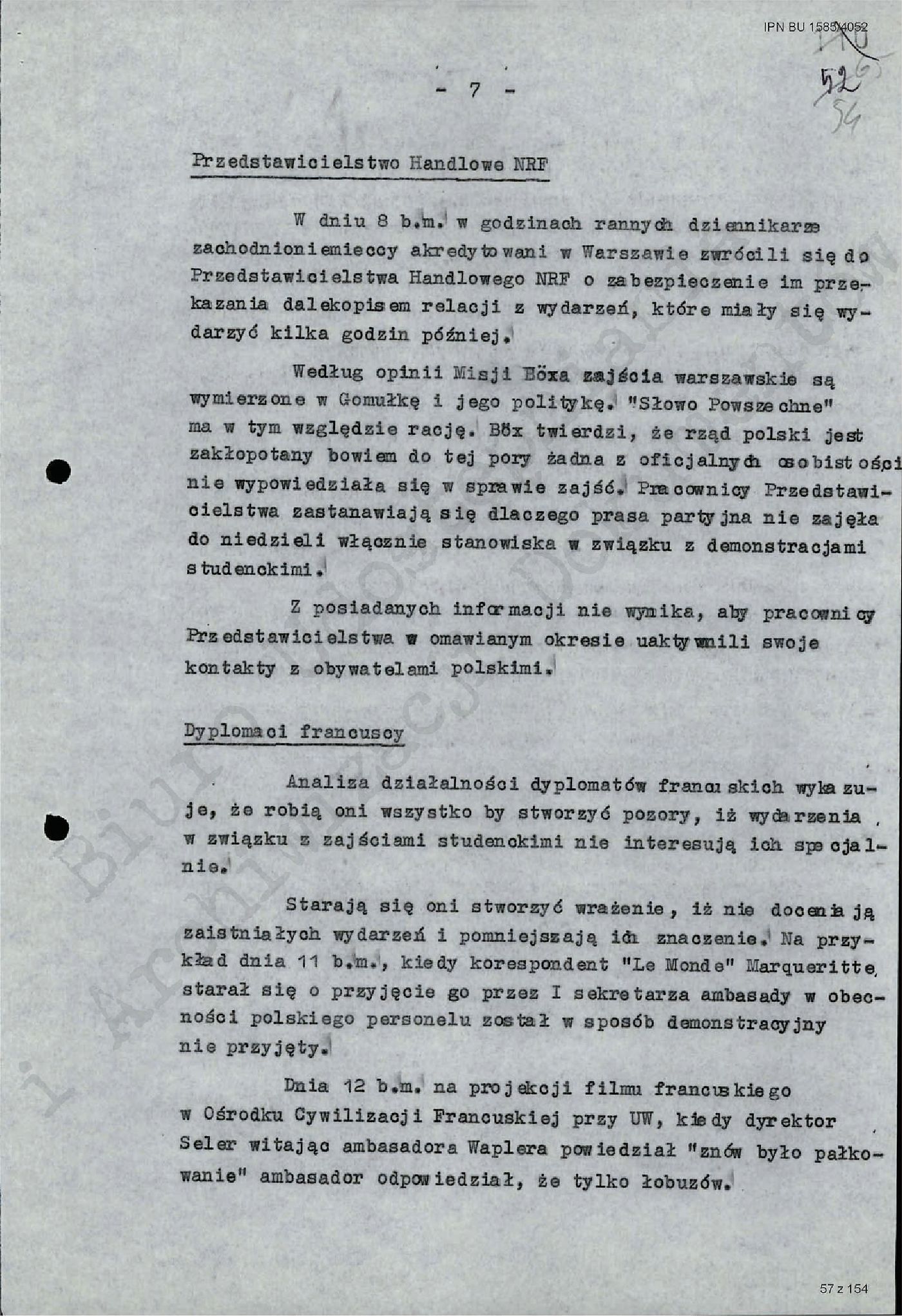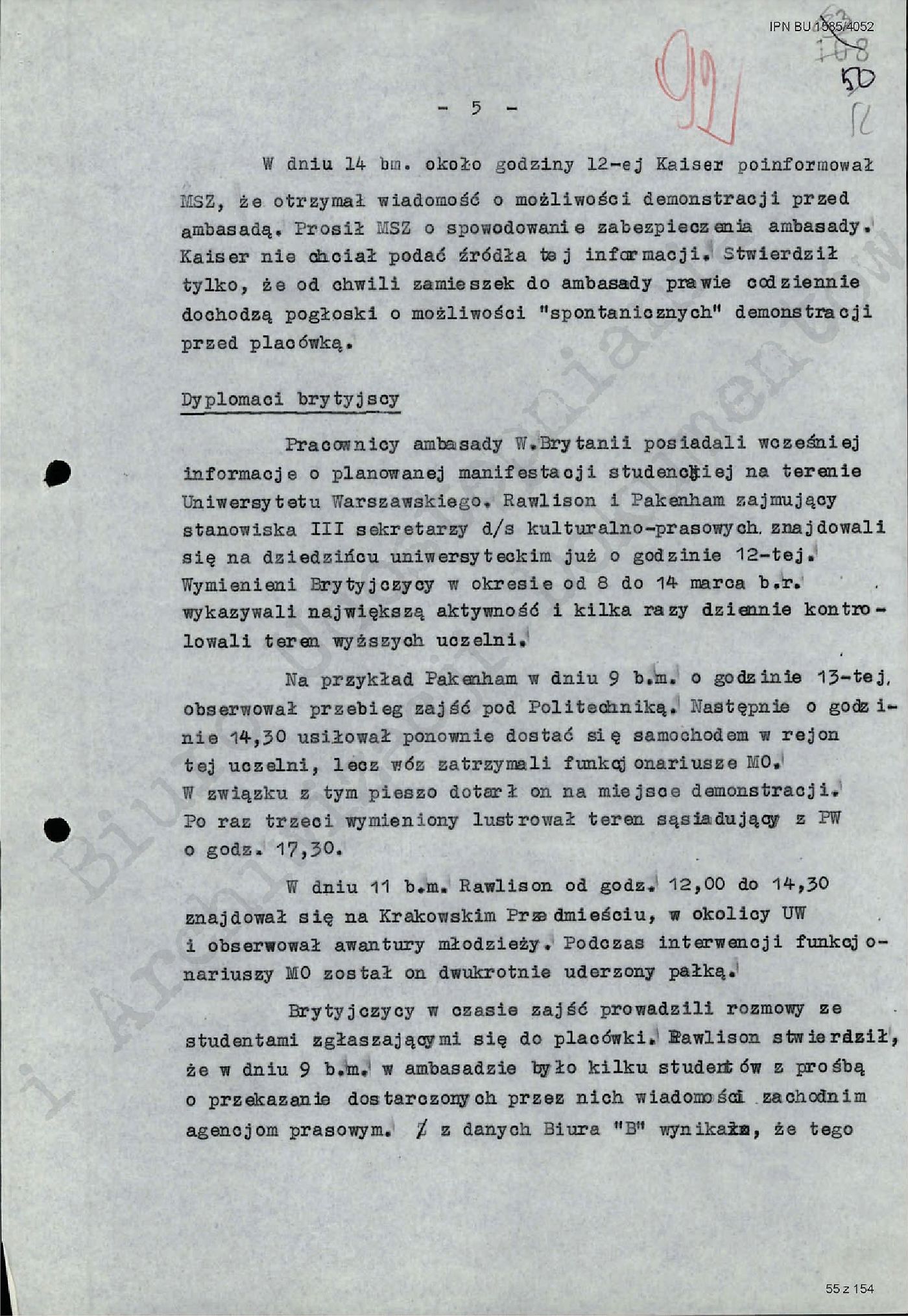z dn. 15.03.1968 r. o działalności zachodnich dyplomatów akredytowanych w Warszawie w dniach 8-14 marca 1968 r. i ich opinii na temat zaistniałych wydarzeń, IPN BU 1585/4052, s. 48-57.