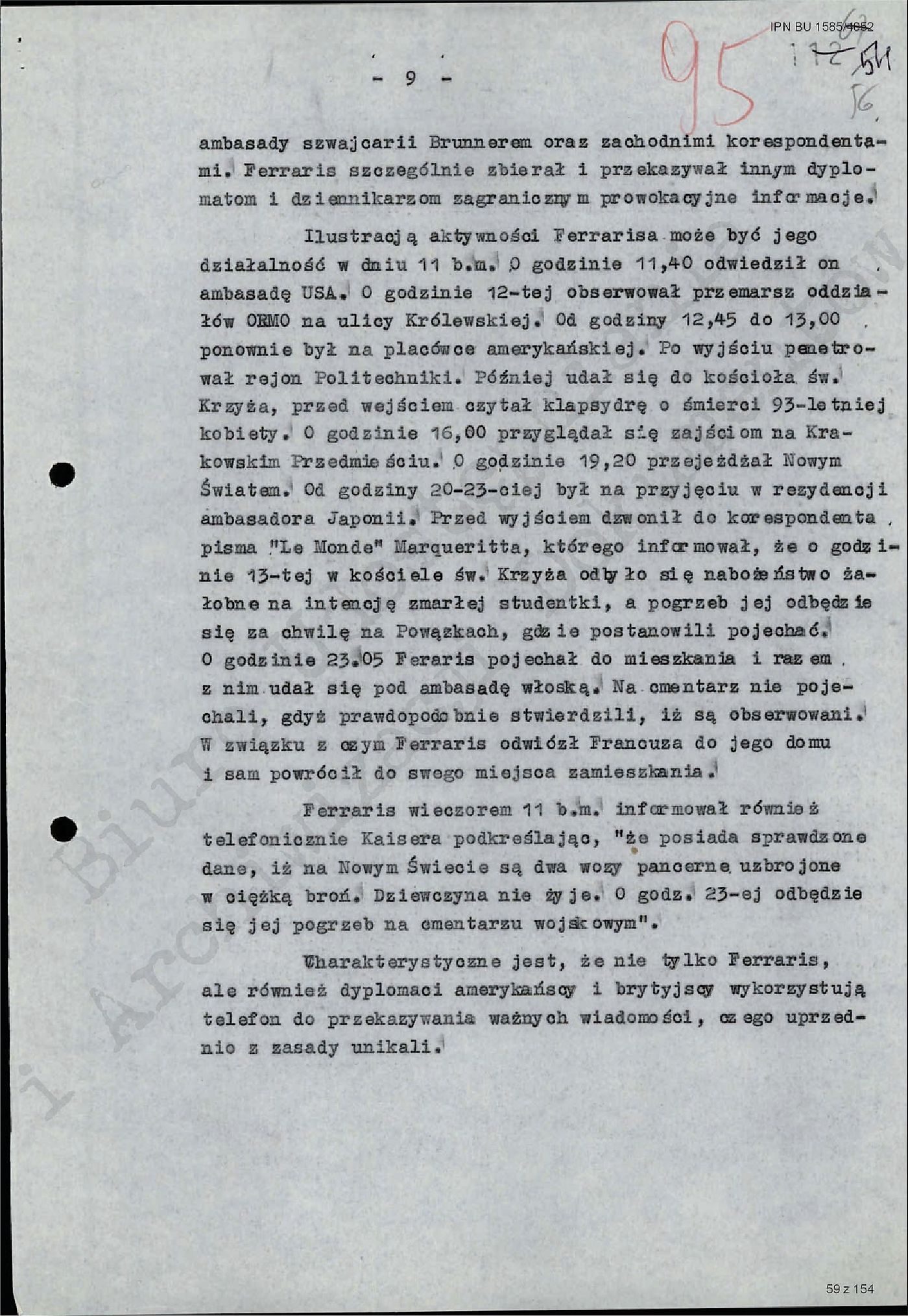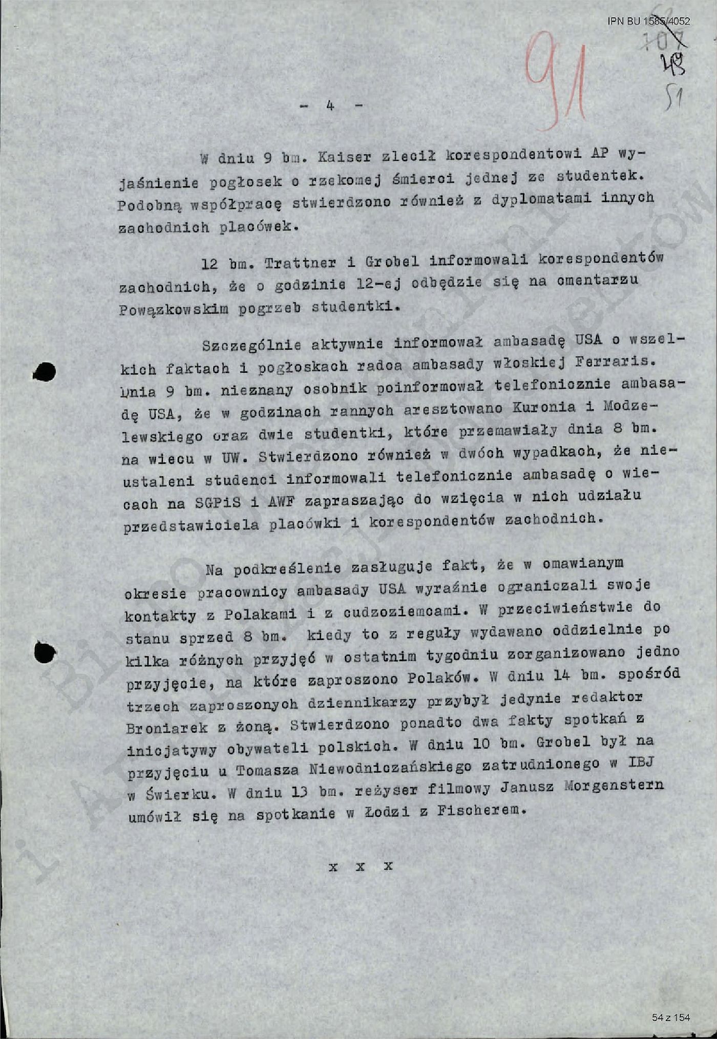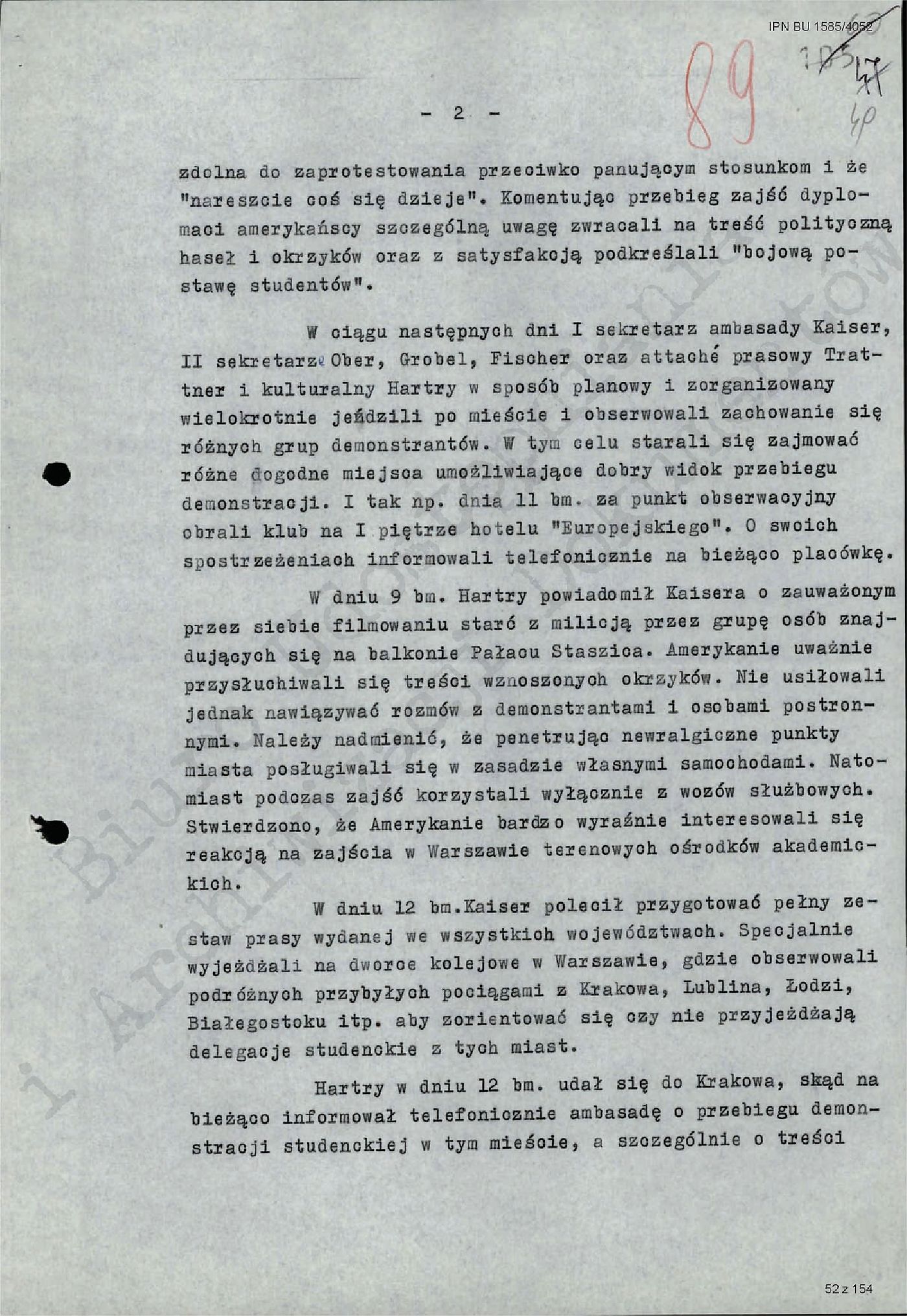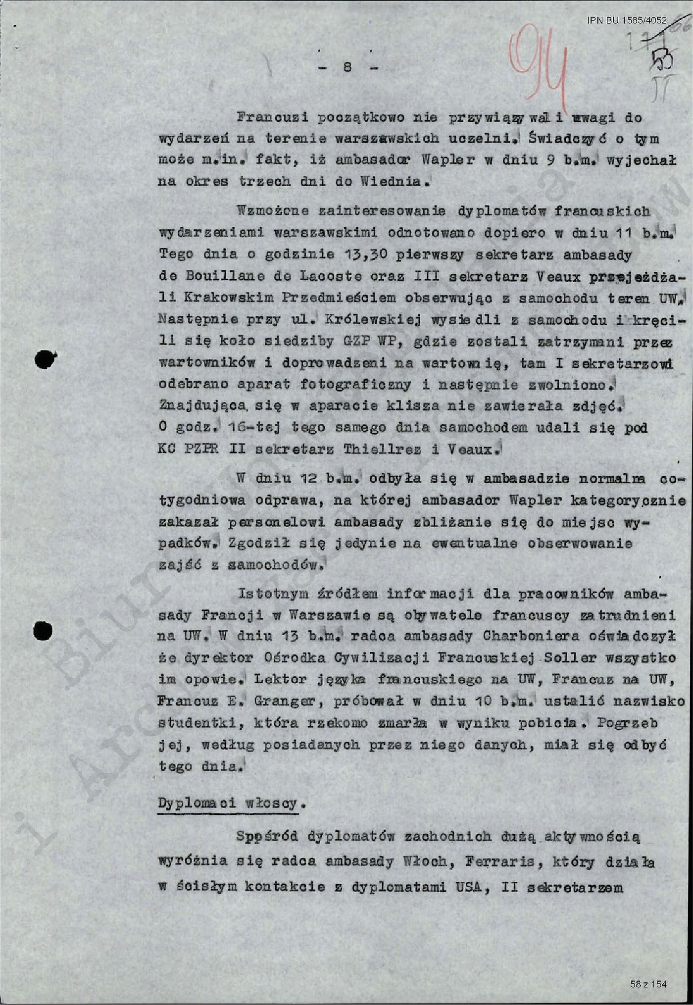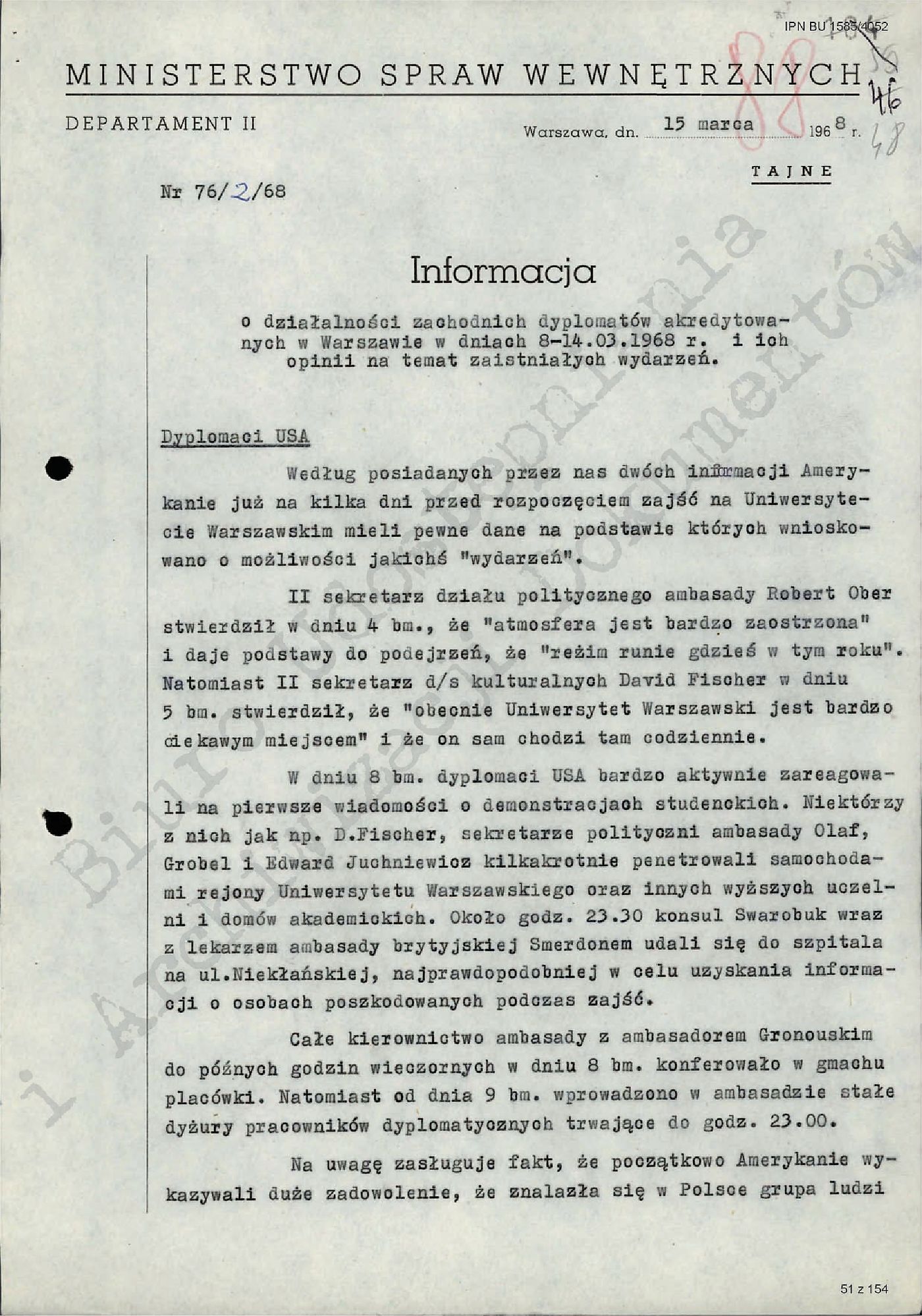 z dn. 15.03.1968 r. o działalności zachodnich dyplomatów akredytowanych w Warszawie w dniach 8-14 marca 1968 r. i ich opinii na temat zaistniałych wydarzeń, IPN BU 1585/4052, s. 48-57.