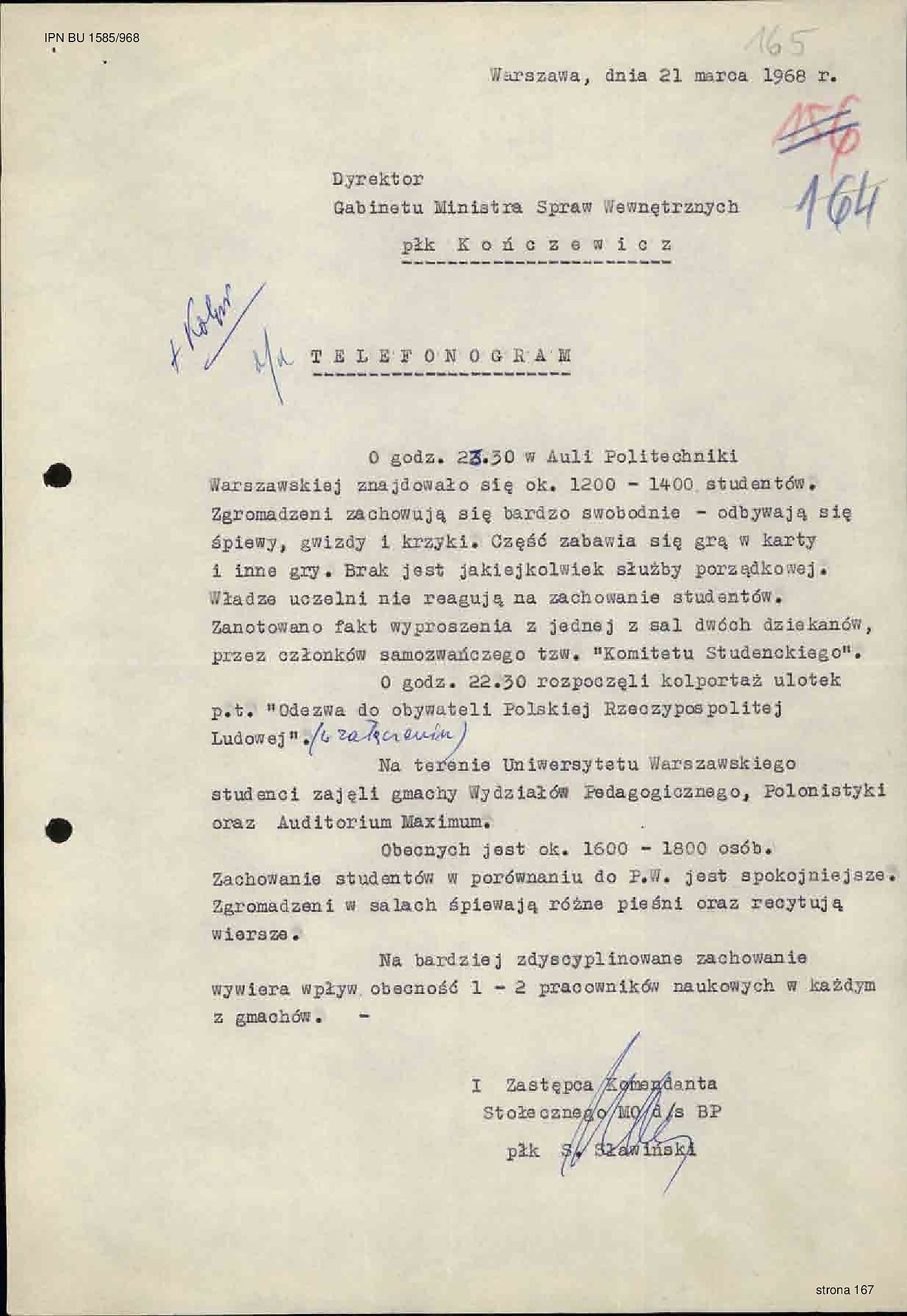 płk. Stanisława Sławińskiego dotyczący strajku okupacyjnego na Politechnice Warszawskiej i na Uniwersytecie Warszawskim w dn. 21.03.1968 r., IPN BU 1585/968, s. 165.
