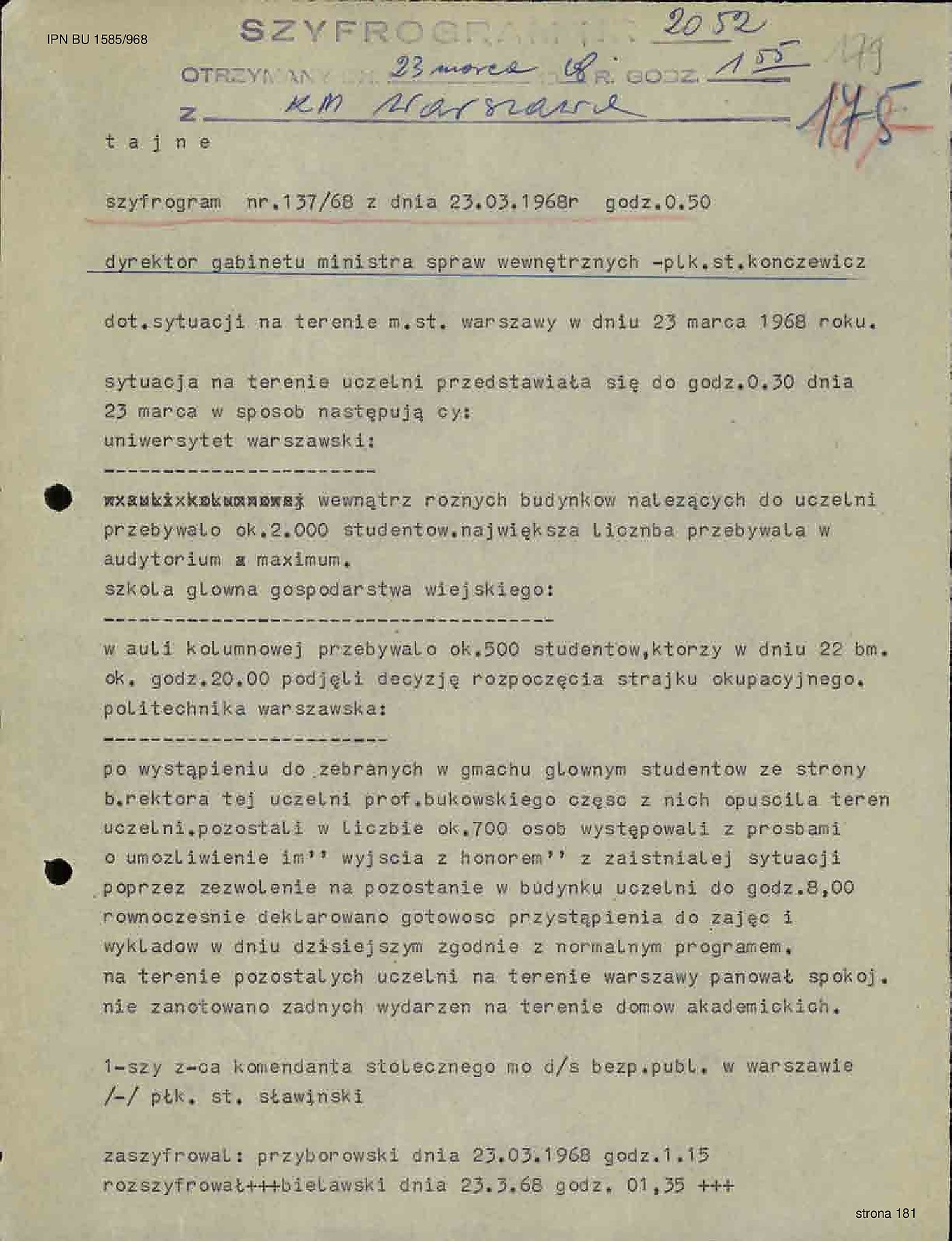 płk. Stanisława Sławińskiego z dn. 23.03.1968 r. dotyczący sytuacji na warszawskich uczelniach, IPN BU 1585/968, s. 179.