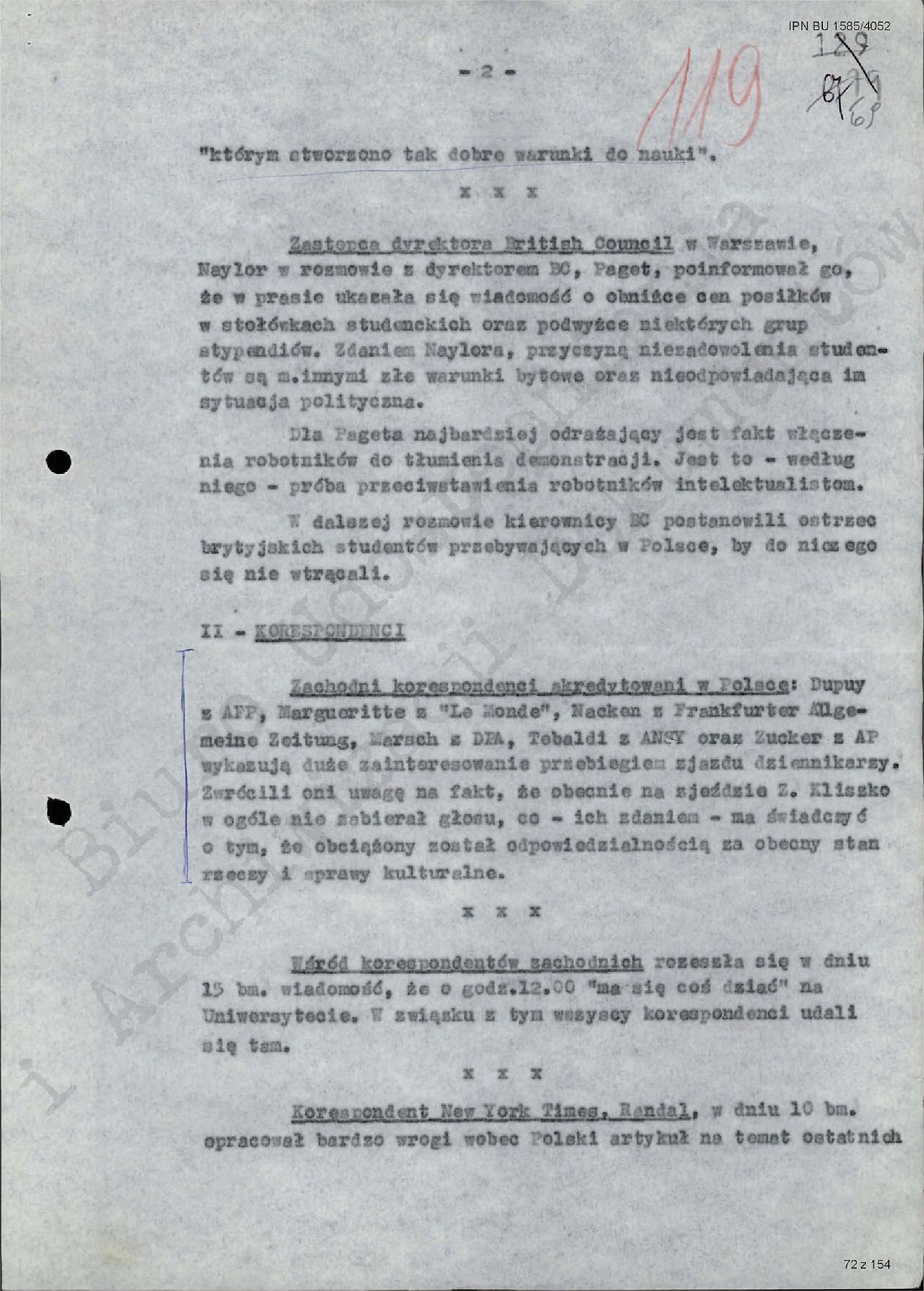 Informacja Departamentu II MSW z dn. 15.03.1968 r. dotycząca interpretacji ostatnich wydarzeń w kraju przez zagranicznych korespondentów i dyplomatów; IPN BU 1585/4052, s. 67-70