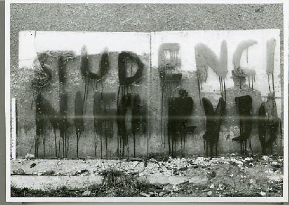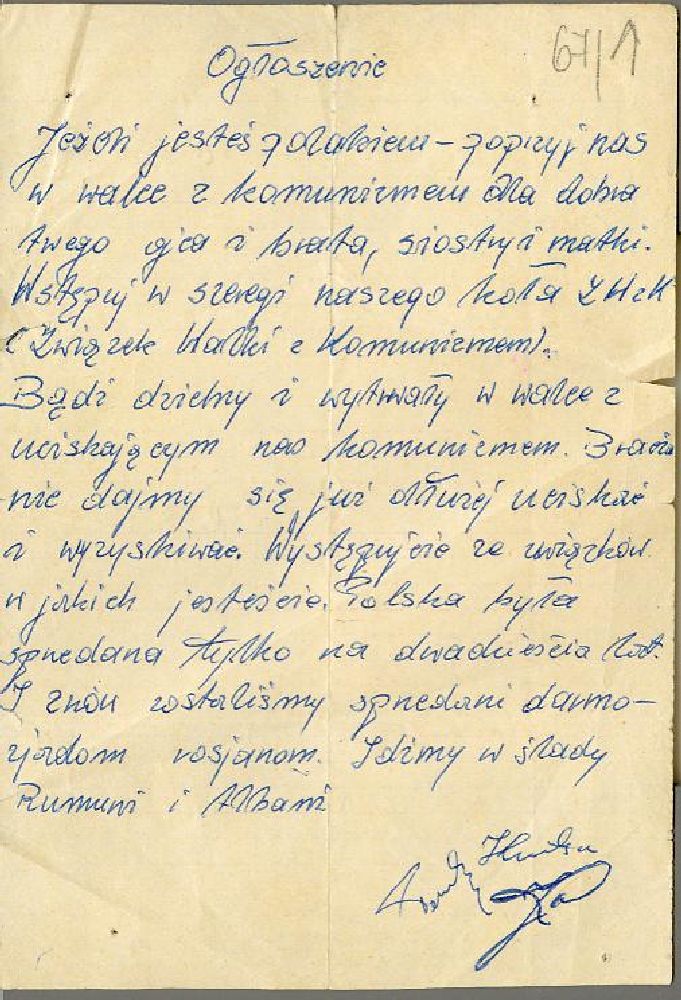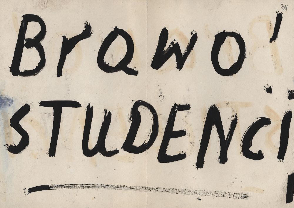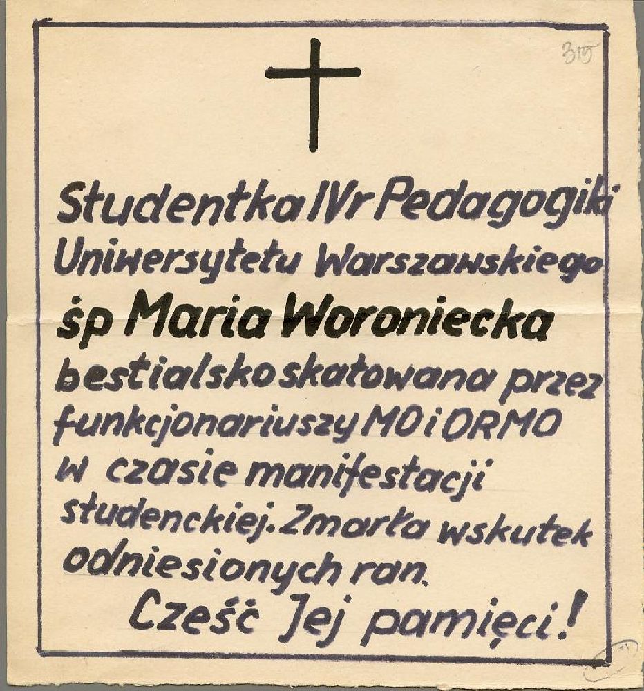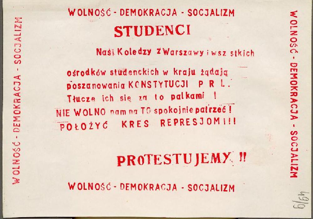 Kielce - ulotka Kielce - ulotka Kielce - ulotka protestacyjna Napis na ścianie budynku: "Studenci niech żyją" Klepsydra Marii Woronieckiej Ogłoszenie wzywające do poparcia Związku Walki z Komunizmem Kielce - ulotka