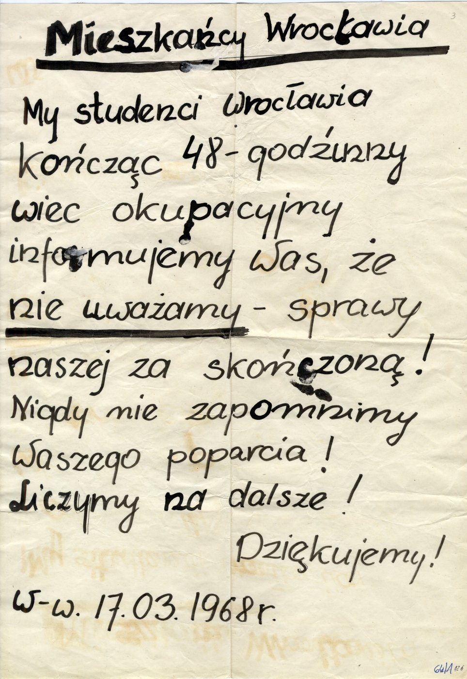 Odezwa studentów do mieszkańców Wrocławia z dn. 17 III 1968 r.,