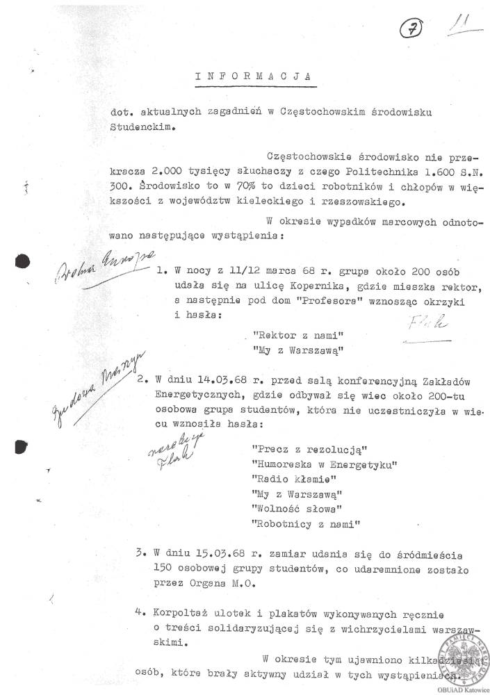 W Częstochowie uaktywnienie tamtejszego środowiska studenckiego nastąpiło na skutek kontroli, którą milicja przeprowadziła w nocy z 11 na 12 marca w akademikach Politechniki Częstochowskiej. O wpół do pierwszej w nocy przed jednym z DS zgromadziła się grupa wzburzonych rewizją studentów, która przeszła następnie pod pozostałe akademiki, pociągając za sobą część ich mieszkańców. Przyłączyli się do nich słuchacze miejscowego Studium Nauczycielskiego. Uformował się pochód (około 200 do 250 osób), który przeszedł na ulicę Kopernika i zatrzymał się przed budynkiem, w którym mieszkali rektor politechniki, przewodniczący MRN i II sekretarz KM PZPR. Młodzież przez kilka minut wznosiła okrzyki: „Precz z rewizją!”, „Rektor z nami!”, „My z Warszawą!”, „Niech żyje Dubczek!, „Niech żyje Czechosłowacja!”. Następnie studenci powrócili do akademików. Rano w celu ustalenia „prowodyrów wyjścia studentów na ulicę” oraz doprowadzenia „do zaniechania dalszych awantur” funkcjonariusze SB, wsparci przez aktyw partyjny i zetemesowski, przeprowadzili z członkami Rad Mieszkańców Domów Studenckich „rozmowy profilaktyczno-ostrzegawcze”. Spotkał się z nimi także rektor politechniki, prof. Jan Grajcar. Wystosował on do studentów apel o zachowanie spokoju. Członkowie Rad Mieszkańców zostali zobowiązani do przeprowadzenia z mieszkańcami DS-ów rozmów zmierzających „do zakończenia rozróbek”. Duże wrażenie zrobiła na młodzieży zapowiedź, że władze uczelni powiadomią o nocnym „incydencie” rodziców uczestników zajść. Przedstawiciele mieszkańców akademików przeprosili za „wywołane ekscesy”, prosząc jednocześnie, aby w stosunku do najbardziej aktywnych demonstrantów nie wyciągać konsekwencji dyscyplinarnych, a także by nie powiadamiać rodziców.