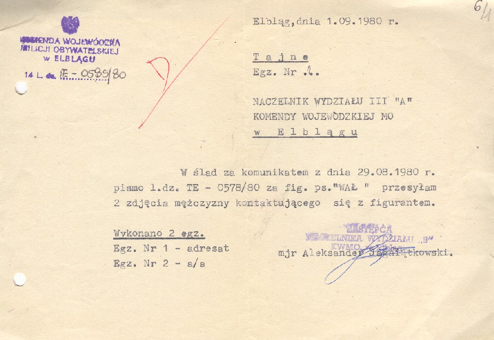 KWMO Elbląg, pismo z dn. 01.09.1980 r. przesyłające zdjęcia mężczyzny kontaktującego się z figurantem