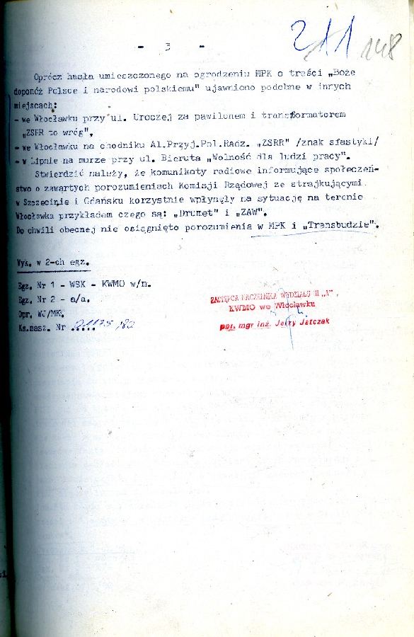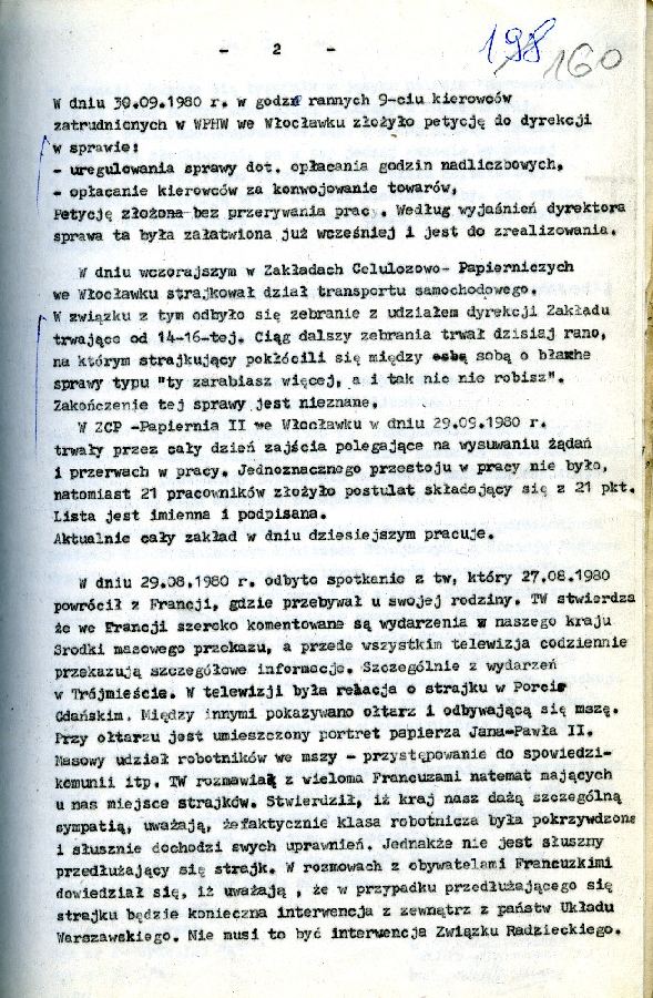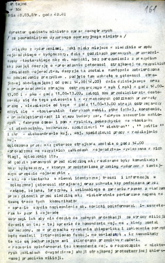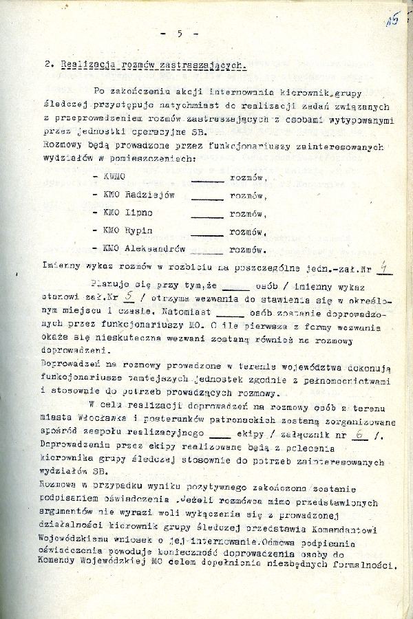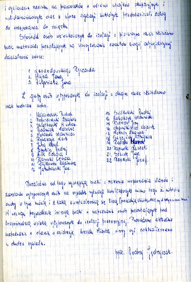 Meldunek o sytuacji społeczno – politycznej w województwie włocławskim z dn.15.12.1980r. #1 Meldunek o sytuacji społeczno – politycznej w województwie włocławskim z dn.15.12.1980r. #2 Informacja o sytuacji społeczno – politycznej w województwie włocławskim w ramach akcji „Lato-80” z dnia 19.08.1980 r. Informacja z dnia 19.08.1980 r. dotycząca wypowiedzi mieszkańców na temat sytuacji społeczno – gospodarczej. Informacja z dnia 19.08.1980 r. dotycząca wypowiedzi mieszkańców na temat sytuacji społeczno – gospodarczej. Notatka służbowa o sytuacji społeczno – politycznej w województwie włocławskim z dnia 30.08.1980 r. #1 Notatka służbowa o sytuacji społeczno – politycznej w województwie włocławskim z dnia 30.08.1980 r. #2 Notatka służbowa o sytuacji społeczno – politycznej w województwie włocławskim z dnia 30.08.1980 r. #3 Informacja o sytuacji społeczno – politycznej na terenie Włocławka z 30.08.1980 r. #1 Informacja o sytuacji społeczno – politycznej na terenie Włocławka z 30.08.1980 r. #2 Informacja o sytuacji społeczno – politycznej na terenie Włocławka z 30.08.1980 r. #3 Notatka służbowa dotycząca sytuacji na terenie Włocławka w związku z wydarzeniami w Bydgoszczy w dniu 19.03.1981 r. #1 Notatka służbowa dotycząca sytuacji na terenie Włocławka w związku z wydarzeniami w Bydgoszczy w dniu 19.03.1981 r. #2 Notatka służbowa dotycząca sytuacji na terenie Włocławka w związku z wydarzeniami w Bydgoszczy w dniu 19.03.1981 r. #3 Meldunek o sytuacji społeczno – politycznej w województwie z dnia 06.12.1981 r. #1 Meldunek o sytuacji społeczno – politycznej w województwie z dnia 06.12.1981 r. #2 Meldunek o sytuacji społeczno – politycznej w województwie z dnia 06.12.1981 r. #3 Meldunek o sytuacji społeczno – politycznej w województwie z dnia 06.12.1981 r. #4 Meldunek o sytuacji społeczno – politycznej w województwie z dnia 06.12.1981 r. #5 Meldunek o sytuacji społeczno – politycznej w województwie z dnia 06.12.1981 r. #6 Meldunek o sytuacji społeczno – politycznej w województwie z dnia 06.12.1981 r. #7 Meldunek o sytuacji społeczno – politycznej w województwie z dnia 06.12.1981 r. #8 Meldunek o sytuacji społeczno – politycznej w województwie z dnia 06.12.1981 r. #9 Meldunek o sytuacji społeczno – politycznej w województwie z dnia 23.01.1981 r. Meldunek o sytuacji społeczno – politycznej w województwie z dnia 20.03.1981 r. #1 Meldunek o sytuacji społeczno – politycznej w województwie z dnia 20.03.1981 r. #2 Meldunek o sytuacji społeczno – politycznej w województwie z dnia 20.03.1981 r. #3 Zestawienie osób przeznaczonych do internowania z dnia 13.02.1981r. Plan internowania i przeprowadzania rozmów zastraszających w ramach akcji „Jodła” 1981 r. #1 Plan internowania i przeprowadzania rozmów zastraszających w ramach akcji „Jodła” 1981 r. #2 Plan internowania i przeprowadzania rozmów zastraszających w ramach akcji „Jodła” 1981 r. #3 Plan internowania i przeprowadzania rozmów zastraszających w ramach akcji „Jodła” 1981 r. #4 Plan internowania i przeprowadzania rozmów zastraszających w ramach akcji „Jodła” 1981 r. #5 Plan internowania i przeprowadzania rozmów zastraszających w ramach akcji „Jodła” 1981 r. #6 Plan internowania i przeprowadzania rozmów zastraszających w ramach akcji „Jodła” 1981 r. #7 Notatka służbowa z dnia 05.12.1980 r. dotycząca zapoznania się z teczkami osób przeznaczonych do izolacji. Notatka służbowa z dnia 05.12.1980 r. dotycząca zapoznania się z teczkami osób przeznaczonych do izolacji. Plan rozmowy ostrzegawczej opracowany w ramach akcji „Klon” z dnia 07.12.1981 r. #1 Plan rozmowy ostrzegawczej opracowany w ramach akcji „Klon” z dnia 07.12.1981 r. #2 Plan rozmowy ostrzegawczej opracowany w ramach akcji „Klon” z dnia 07.12.1981 r. #3 Plan rozmowy ostrzegawczej opracowany w ramach akcji „Klon” z dnia 07.12.1981 r. #4