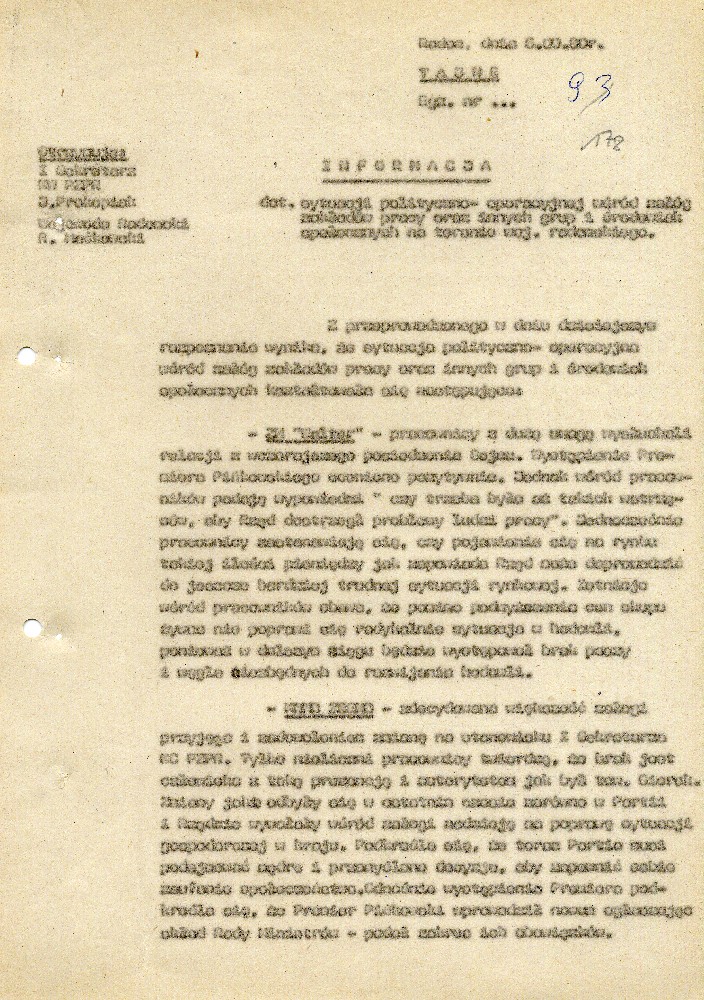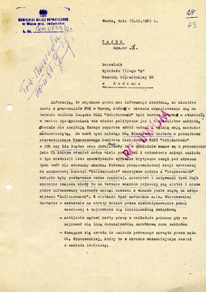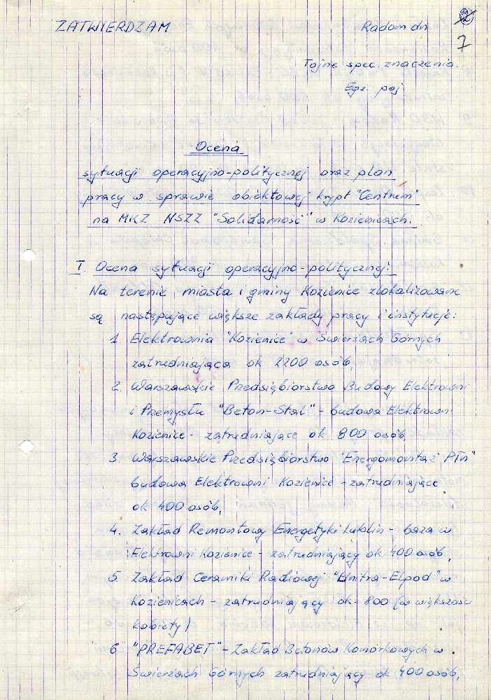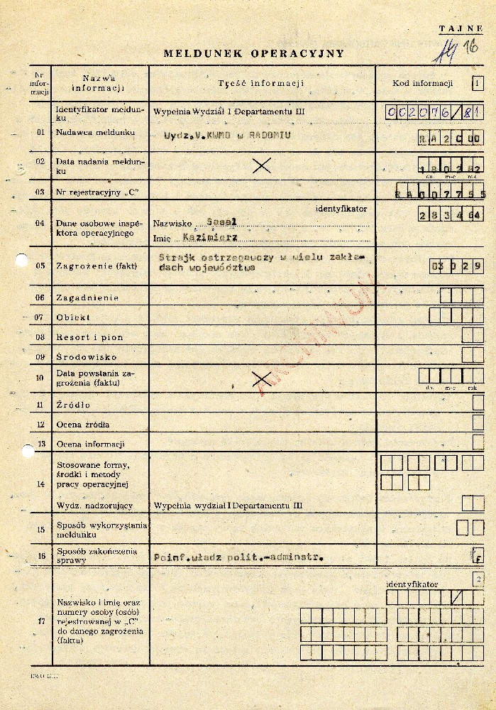 1981 grudzień 16, Radom – Meldunek operacyjny naczelnika Wydziału III KWMO w Radomiu kpt. Tadeusza Żabińskiego dot. sprawy operacyjnego rozpracowania krypt. „Przekonania” założonej w związku z powołaniem Komitetu Obrony Więzionych za Przekonania przy NSZZ
