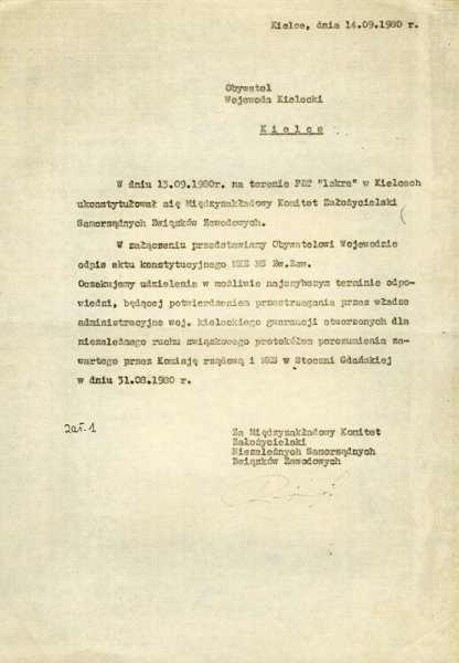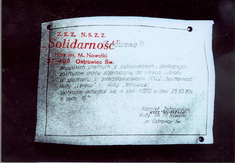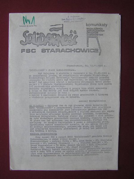 Informacja o przyczynach, przebiegu i okolicznościach strajku w Fabryce Łożysk Tocznych „Iskra” w Kielcach we wrześniu 1980 roku. Ze zbiorów Juliusza Brauna Informacja o powstaniu 13 września 1980 roku w Kielcach Międzyzakładowego Komitetu Założycielskiego Niezależnych Samorządnych Związków Zawodowych. Ze zbiorów Juliusza Brauna Informacja o spotkaniu w dniu 23.10.1980 roku w hali sportowej KSZO w Ostrowcu Świętokrzyskim. Ze zbiorów Wiesława Kwiatkowskiego Hutnicza Solidarność: Biuletyn Informacyjny Niezależnego Samorządnego Związku Zawodowego „Solidarność”, Huty im. M. Nowotki w Ostrowcu Świętokrzyskim z 30.10.1980 roku. Ze zbiorów Biblioteki Głównej Uniwersytetu Jana Kochanowskiego w K „Komunikaty Niezależnych Samorządnych Związków Zawodowych ,Solidarność,” Fabryki Samochodów Ciężarowych Starachowice z 10.11.1980 roku. Ze zbiorów Biblioteki Głównej Uniwersytetu Jana Kochanowskiego w Kielcach (zbiory specjalne)