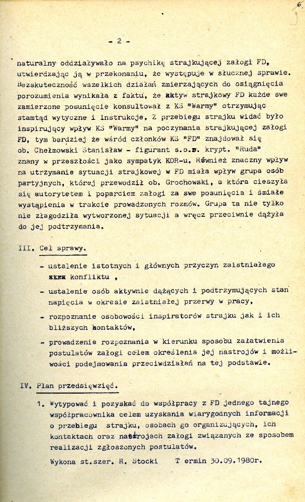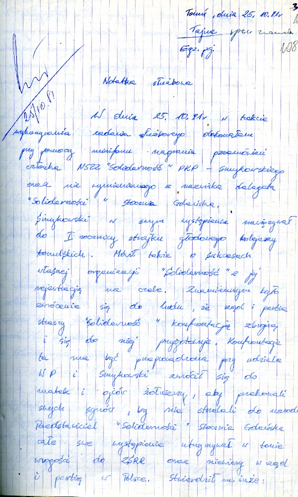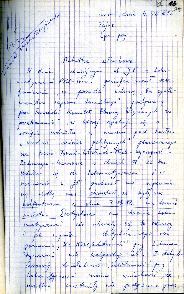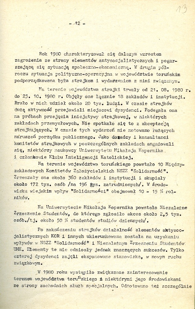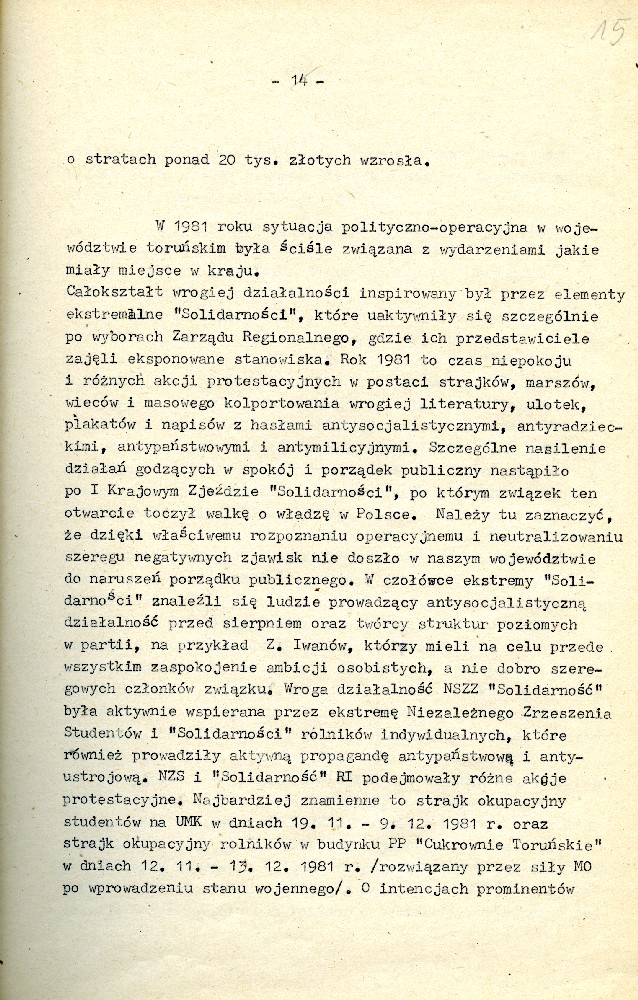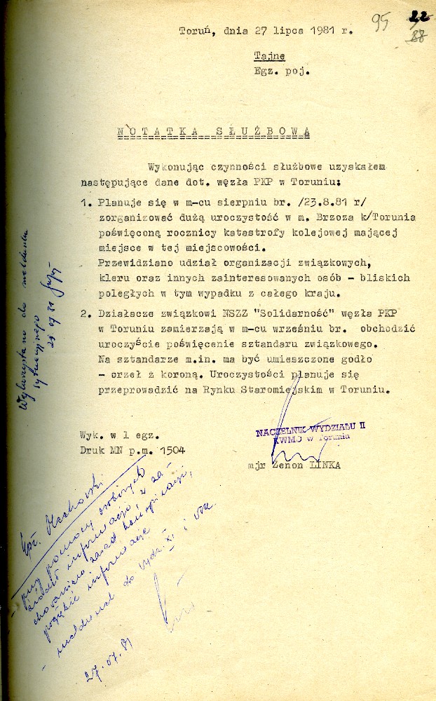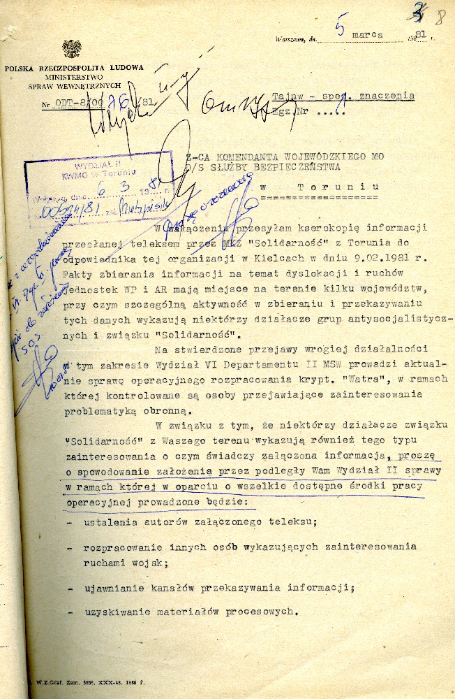 Plan przedsięwzięć operacyjnych kryptonim „Dom” dotyczącej zorganizowania strajku w Fabryce Domów w Grudziądzu w dniu 27.08.1980 r. #1 Plan przedsięwzięć operacyjnych kryptonim „Dom” dotyczącej zorganizowania strajku w Fabryce Domów w Grudziądzu w dniu 27.08.1980 r. #2 Plan przedsięwzięć operacyjnych kryptonim „Dom” dotyczącej zorganizowania strajku w Fabryce Domów w Grudziądzu w dniu 27.08.1980 r. #3 Plan przedsięwzięć operacyjnych kryptonim „Dom” dotyczącej zorganizowania strajku w Fabryce Domów w Grudziądzu w dniu 27.08.1980 r. #4 Pismo z dnia 05.03.1981 r. informujące o wzmożonym zainteresowaniu dyslokacją wojsk polskich i radzieckich. Pismo z dnia 05.03.1981 r. informujące o wzmożonym zainteresowaniu dyslokacją wojsk polskich i radzieckich. Notatka służbowa z dnia 23.09.1980 r. informująca o próbie utworzenia Wolnych Związków Zawodowych przez kolejarzy w Toruniu. /Ze sprawy kryptonim „Truman”/ Ogłoszenie strajku głodowego – materiał dołączony do sprawy operacyjnego rozpracowania kryptonim „Truman”. Pismo do KW MO w Katowicach informujące o działalności opozycyjnej jednego z czołowych działaczy „Solidarności” przy Lokomotywowni PKP w Toruniu. /Ze sprawy kryptonim „Truman”/ Pismo do KW MO w Katowicach informujące o działalności opozycyjnej jednego z czołowych działaczy „Solidarności” przy Lokomotywowni PKP w Toruniu. /Ze sprawy kryptonim „Truman”/ Notatka służbowa z dnia 04.08.1981 r. dotycząca odezwy Toruńskiego Komitetu Obrony Więzionych za Przekonania. /Ze sprawy kryptonim „Truman”/ Notatka służbowa z dnia 27.07.1981 r. dotycząca obchodów rocznicy katastrofy kolejowej pod Toruniem oraz uroczystości poświęcenia sztandaru związkowego. /Ze sprawy kryptonim „Truman”/ Notatka służbowa z dnia 25.10.1981 r. /Ze sprawy kryptonim „Truman”/ Stenogram ślubowania kolejarzy podczas uroczystości poświęcenia sztandaru./Ze sprawy kryptonim „Truman”/ Postanowienie Wiceprokuratora Wojewódzkiego o odmowie wszczęcia postępowania przygotowawczego. /Ze sprawy kryptonim „Truman”/ Postanowienie Wiceprokuratora Wojewódzkiego o odmowie wszczęcia postępowania przygotowawczego. /Ze sprawy kryptonim „Truman”/ Kontrwywiadowcza charakterystyka województwa toruńskiego. /Fragment/ #1 Kontrwywiadowcza charakterystyka województwa toruńskiego. /Fragment/ #2 Kontrwywiadowcza charakterystyka województwa toruńskiego. /Fragment/ #3 Kontrwywiadowcza charakterystyka województwa toruńskiego. /Fragment/ #4 Kontrwywiadowcza charakterystyka województwa toruńskiego. /Fragment/ #5