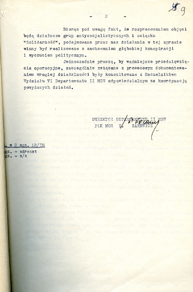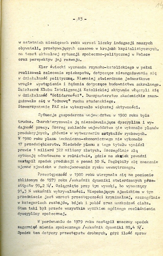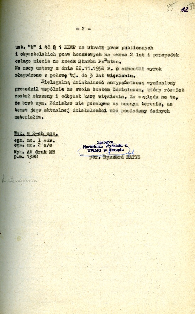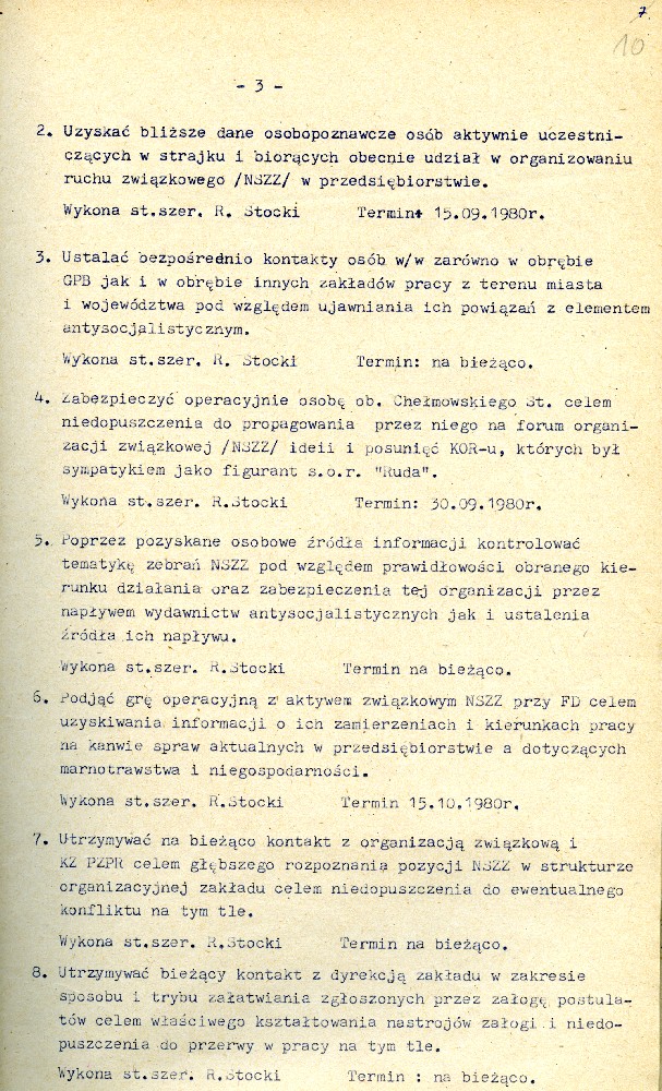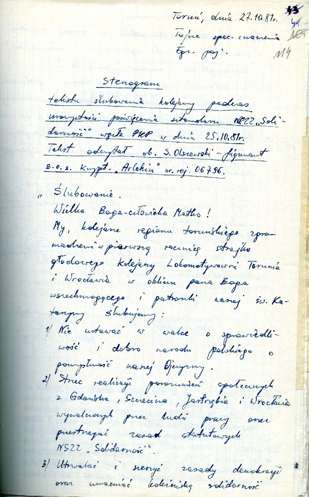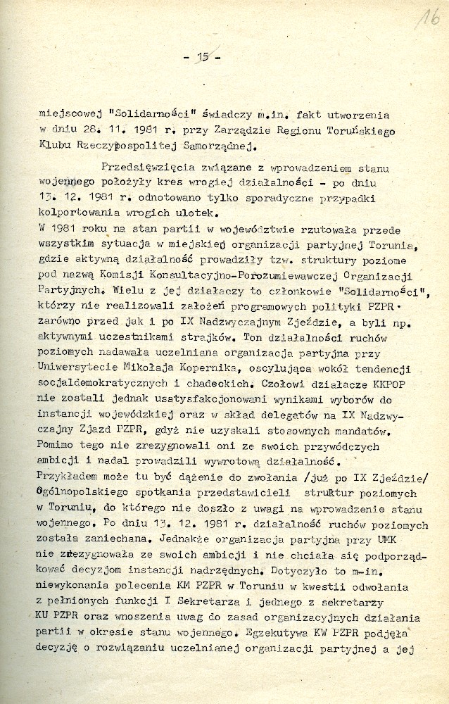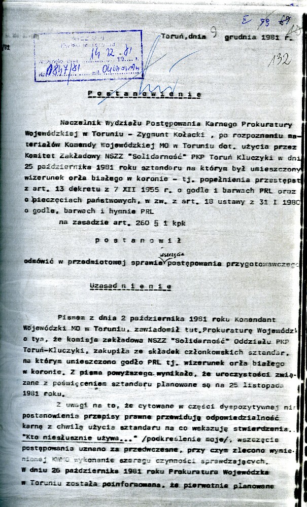 Plan przedsięwzięć operacyjnych kryptonim „Dom” dotyczącej zorganizowania strajku w Fabryce Domów w Grudziądzu w dniu 27.08.1980 r. #1 Plan przedsięwzięć operacyjnych kryptonim „Dom” dotyczącej zorganizowania strajku w Fabryce Domów w Grudziądzu w dniu 27.08.1980 r. #2 Plan przedsięwzięć operacyjnych kryptonim „Dom” dotyczącej zorganizowania strajku w Fabryce Domów w Grudziądzu w dniu 27.08.1980 r. #3 Plan przedsięwzięć operacyjnych kryptonim „Dom” dotyczącej zorganizowania strajku w Fabryce Domów w Grudziądzu w dniu 27.08.1980 r. #4 Pismo z dnia 05.03.1981 r. informujące o wzmożonym zainteresowaniu dyslokacją wojsk polskich i radzieckich. Pismo z dnia 05.03.1981 r. informujące o wzmożonym zainteresowaniu dyslokacją wojsk polskich i radzieckich. Notatka służbowa z dnia 23.09.1980 r. informująca o próbie utworzenia Wolnych Związków Zawodowych przez kolejarzy w Toruniu. /Ze sprawy kryptonim „Truman”/ Ogłoszenie strajku głodowego – materiał dołączony do sprawy operacyjnego rozpracowania kryptonim „Truman”. Pismo do KW MO w Katowicach informujące o działalności opozycyjnej jednego z czołowych działaczy „Solidarności” przy Lokomotywowni PKP w Toruniu. /Ze sprawy kryptonim „Truman”/ Pismo do KW MO w Katowicach informujące o działalności opozycyjnej jednego z czołowych działaczy „Solidarności” przy Lokomotywowni PKP w Toruniu. /Ze sprawy kryptonim „Truman”/ Notatka służbowa z dnia 04.08.1981 r. dotycząca odezwy Toruńskiego Komitetu Obrony Więzionych za Przekonania. /Ze sprawy kryptonim „Truman”/ Notatka służbowa z dnia 27.07.1981 r. dotycząca obchodów rocznicy katastrofy kolejowej pod Toruniem oraz uroczystości poświęcenia sztandaru związkowego. /Ze sprawy kryptonim „Truman”/ Notatka służbowa z dnia 25.10.1981 r. /Ze sprawy kryptonim „Truman”/ Stenogram ślubowania kolejarzy podczas uroczystości poświęcenia sztandaru./Ze sprawy kryptonim „Truman”/ Postanowienie Wiceprokuratora Wojewódzkiego o odmowie wszczęcia postępowania przygotowawczego. /Ze sprawy kryptonim „Truman”/ Postanowienie Wiceprokuratora Wojewódzkiego o odmowie wszczęcia postępowania przygotowawczego. /Ze sprawy kryptonim „Truman”/ Kontrwywiadowcza charakterystyka województwa toruńskiego. /Fragment/ #1 Kontrwywiadowcza charakterystyka województwa toruńskiego. /Fragment/ #2 Kontrwywiadowcza charakterystyka województwa toruńskiego. /Fragment/ #3 Kontrwywiadowcza charakterystyka województwa toruńskiego. /Fragment/ #4 Kontrwywiadowcza charakterystyka województwa toruńskiego. /Fragment/ #5