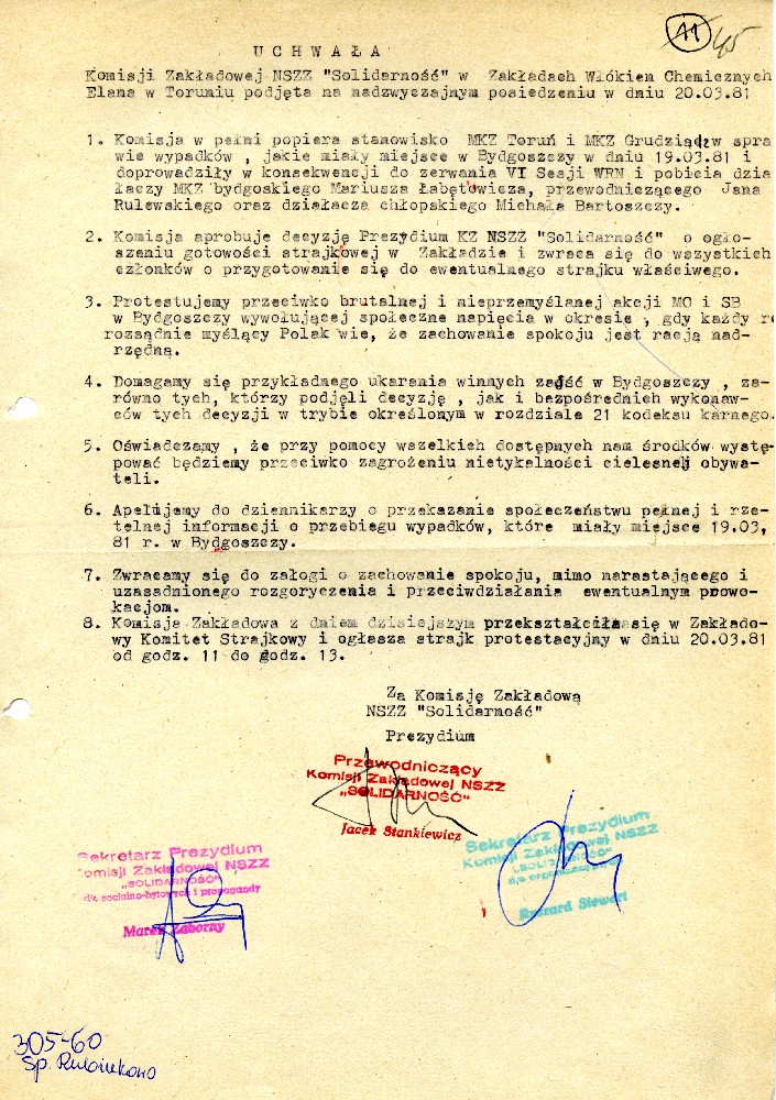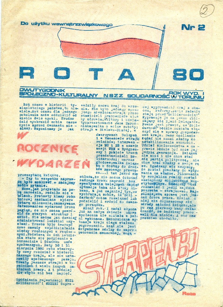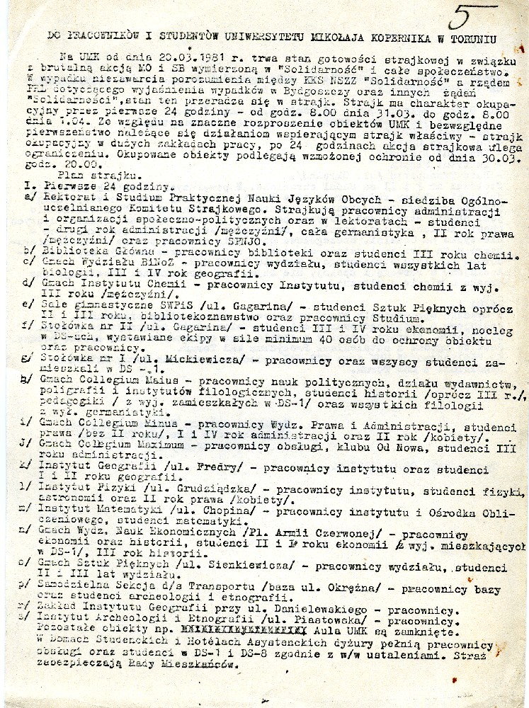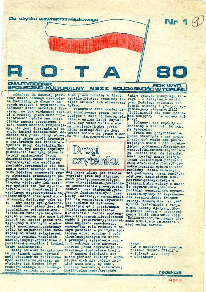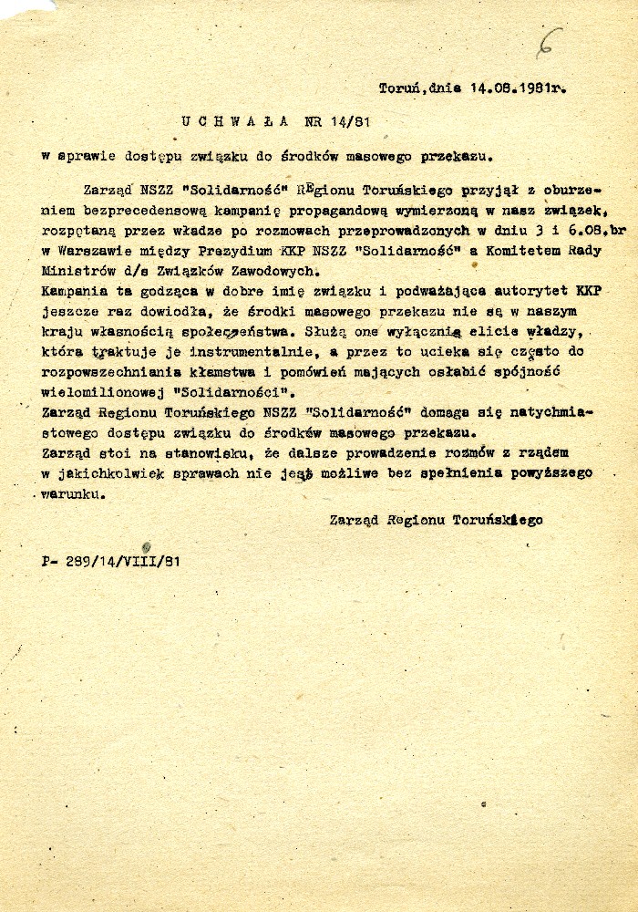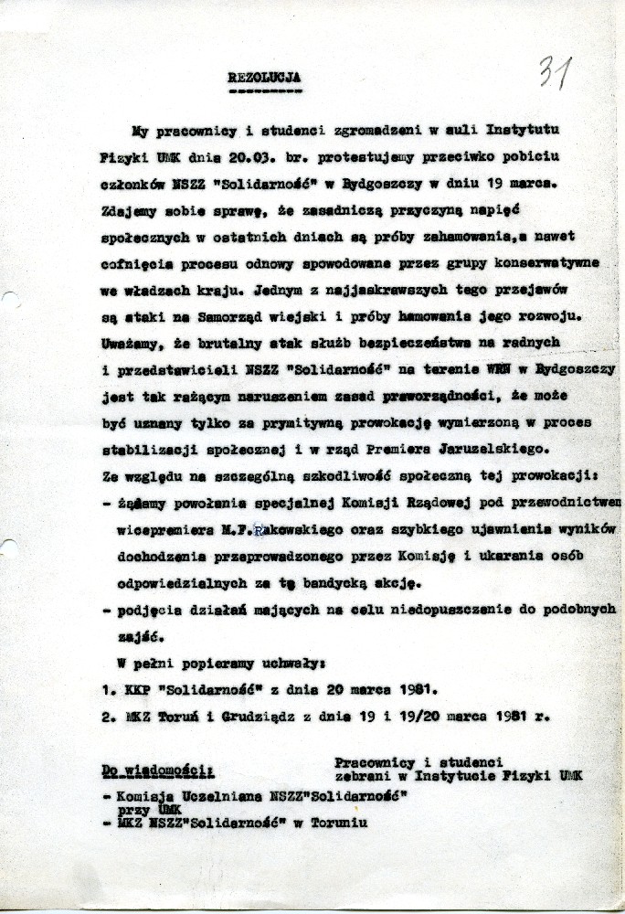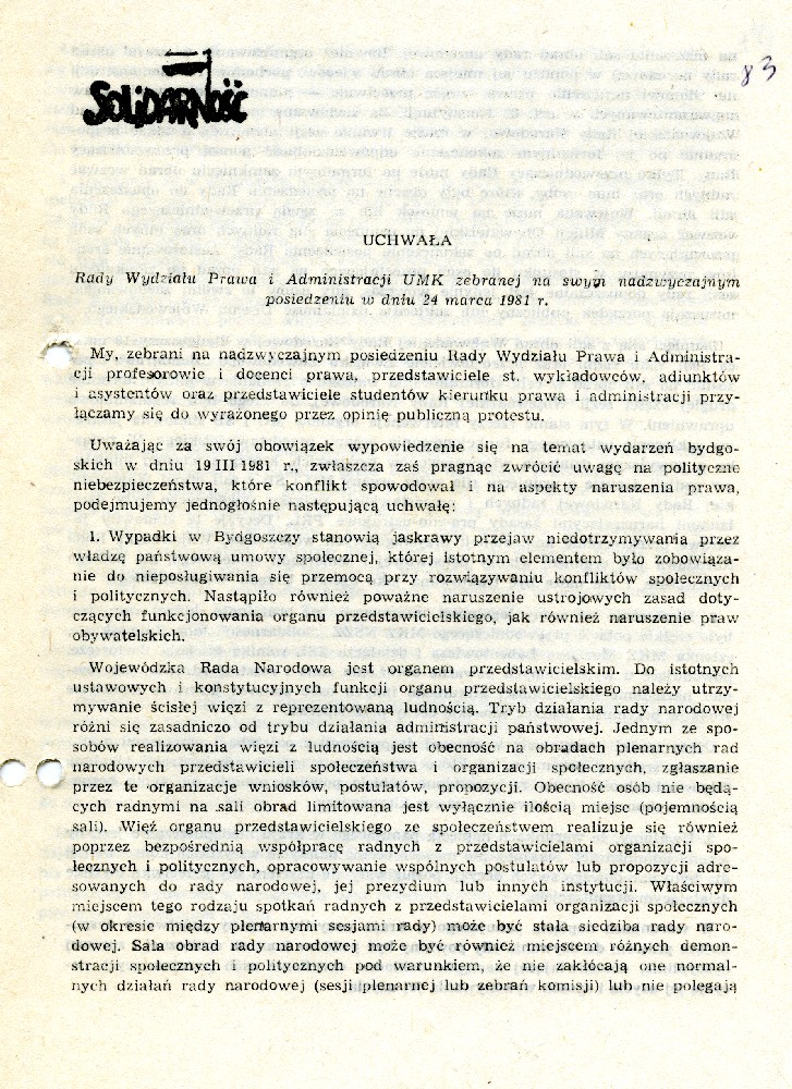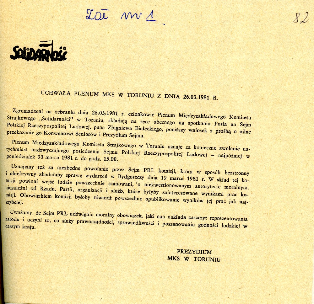 „Wolne Słowo” – Biuletyn Informacyjny NSZZ „Solidarność” nr 42 Odezwa Ogólnouczelnianego Komitetu Strajkowego Uniwersytetu Mikołaja Kopernika w Toruniu z 28.03.1981 r. „Solidarność” UMK – Biuletyn Informacyjno – Publicystyczny /karta tytułowa/ Biuletyn NSZZ „Solidarność” ZWCh „Elana” w Toruniu „Rota” dwutygodnik NSZZ „Solidarność” w Toruniu nr 1 /karta tytułowa/ „Rota” dwutygodnik NSZZ „Solidarność” w Toruniu nr 2 /karta tytułowa/ „Rzeczy Chłopska” – tygodnik NSZZ RI „Solidarność” nr 11 „Rzeczy Chłopska” – tygodnik NSZZ RI „Solidarność” nr 12 Biuletyn NSZZ „Solidarność” ZWCh „ELANA” w Toruniu z 20.01.1981 r. „Immunitet” –Niezależny Biuletyn Studencki nr 1 UMK w Toruniu Uchwała Prezydium MKZ NSZZ „Solidarność” w Toruniu z 3 marca 1981 r. „Motor Odnowy” Serwis Informacyjny NSZZ ‘Solidarność” POLMOZBYT Odezwa Zarządu Uczelnianego NZS UMK w Toruniu Oświadczenie Zarządu Uczelnianego NZS UMK w Toruniu z dnia 22 marca 1981 r. Informacja dla rolników zakładających „Solidarność Chłopską” Oświadczenie Zarządu Uczelnianego NZS UMK w Toruniu z dnia 22 marca 1981 r. Odezwa do rolników Odezwa Toruńskiego Komitetu Obrony Więzionych za Przekonania Wywiad z Janem Rulewskim z 22.03.1981 r. Komunikat MKZ NZSS „Solidarność” o wydarzeniach w Bydgoszczy w dniu 19.03.1981 r. Uchwała KKP z 20 marca 1981 r. „Immunitet” –Niezależny Biuletyn Studencki nr 11 UMK w Toruniu Uchwała w sprawie dostępu do środków masowego przekazu z 14.08.1981 r. Serwis Toruńskiej Agencji „Solidarności” z 18.11.1981 r. Komunikat MKZ NSZZ „Solidarność” w sprawie 5 dniowego tygodnia pracy "Immunitet” –Niezależny Biuletyn Studencki UMK w Toruniu wyd. nadzwyczajne 11.11.1980 r. #1 "Immunitet” –Niezależny Biuletyn Studencki UMK w Toruniu wyd. nadzwyczajne 11.11.1980 r. #2 "Immunitet” –Niezależny Biuletyn Studencki UMK w Toruniu wyd. nadzwyczajne 11.11.1980 r. #3 "Immunitet” –Niezależny Biuletyn Studencki UMK w Toruniu wyd. nadzwyczajne 11.11.1980 r. #4 "Immunitet” –Niezależny Biuletyn Studencki UMK w Toruniu wyd. nadzwyczajne 11.11.1980 r. #5 "Immunitet” –Niezależny Biuletyn Studencki UMK w Toruniu wyd. nadzwyczajne 11.11.1980 r. #6 "Immunitet” –Niezależny Biuletyn Studencki UMK w Toruniu wyd. nadzwyczajne 11.11.1980 r. #7 "Immunitet” –Niezależny Biuletyn Studencki UMK w Toruniu wyd. nadzwyczajne 11.11.1980 r. #8 "Immunitet” –Niezależny Biuletyn Studencki UMK w Toruniu wyd. nadzwyczajne 11.11.1980 r. #9 "Immunitet” –Niezależny Biuletyn Studencki UMK w Toruniu wyd. nadzwyczajne 11.11.1980 r. #10 "Immunitet” –Niezależny Biuletyn Studencki UMK w Toruniu wyd. nadzwyczajne 11.11.1980 r. #11 Komunikat MKZ NSZZ „Solidarność w Toruniu Projekt Uchwały MKZ NSZZ „Solidarność” z 28.04.1981 r. Pismo NSZZ „Solidarność” przy ZWCh „ELANA” w sprawie zdobywania dodatkowych zawodów. Uchwała Rady Wydziału Prawa i Administracji UMK z 24 marca 1981 r. #1 Uchwała Rady Wydziału Prawa i Administracji UMK z 24 marca 1981 r. #2 Uchwała Rady Wydziału Prawa i Administracji UMK z 24 marca 1981 r. #3 Uchwała Rady Wydziału Prawa i Administracji UMK z 24 marca 1981 r. #4 Pismo w sprawie rozpoczęcia akcji strajkowej w Wojewódzkim Przedsiębiorstwie Energetyki Cieplnej Rezolucja MKS w Toruniu z dnia 27.03.1981 r. Uchwała NSZZ „Solidarność” przy Sądzie Rejonowym w Toruniu 24.03.1981 r. Informacja o stanie gotowości strajkowej w Toruńskich Zakładach Urządzeń Okrętowych „Towimor” 20.03.1981 r. Uchwała NSZZ „Solidarność” przy Zakładach „METALCHEM” Rezolucja Pracowników i studentów Instytutu Fizyki UMK 20.03.1981 r. Uchwała NSZZ „Solidarność” przy Zakładach „Towimor” 21.03.1981 r. Rezolucja studentów UMK Rezolucja KZ PZPR przy Zakładach „Towimor” 23.03.1981 r. Oświadczenie Komitetu Porozumiewawczego Stowarzyszeń Naukowych i Twórczych 22.03.1981 r. Uchwała KZ NSZZ „Solidarność ”przy ZWCh „ELANA” 20.03.1981 r. Serwis Informacyjny NSZZ „Solidarność” w Toruniu - teleksy