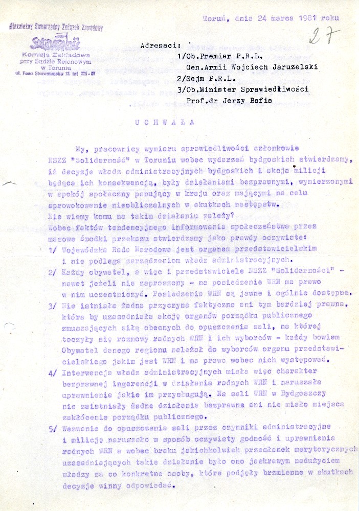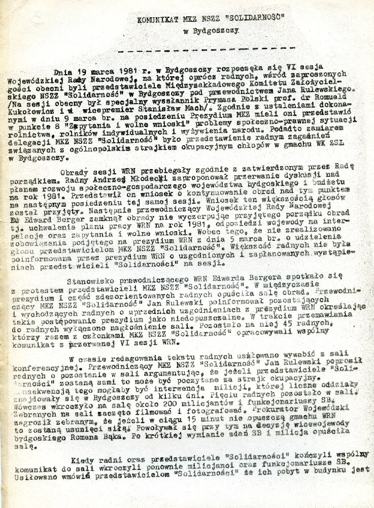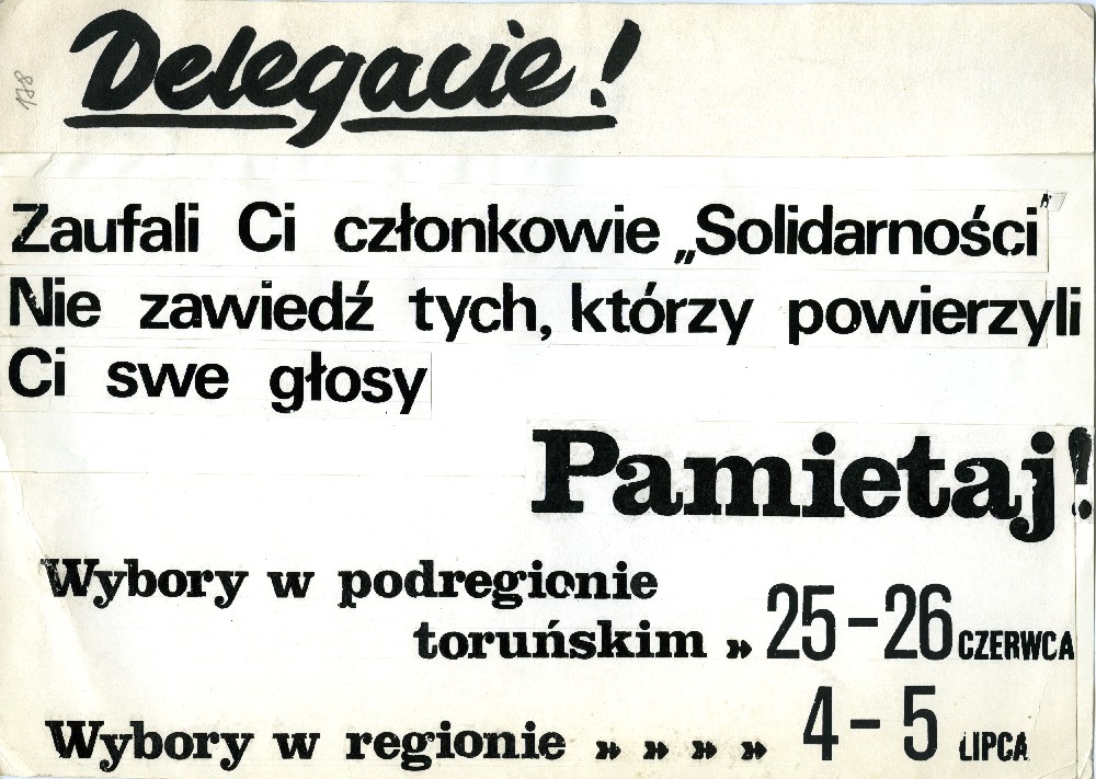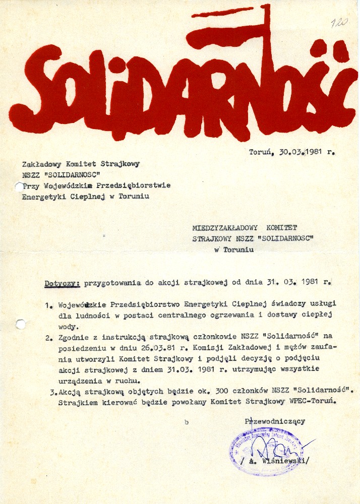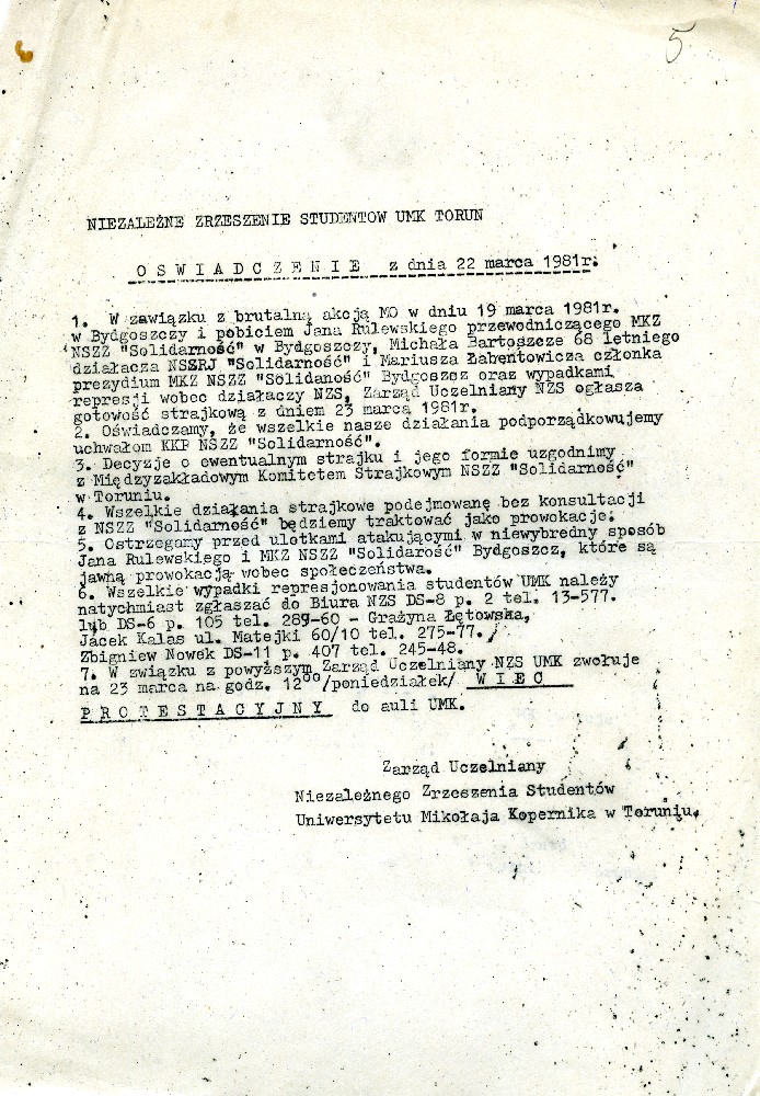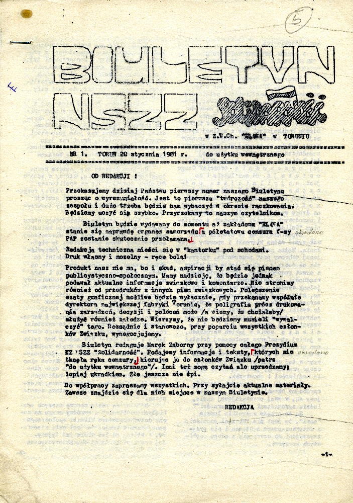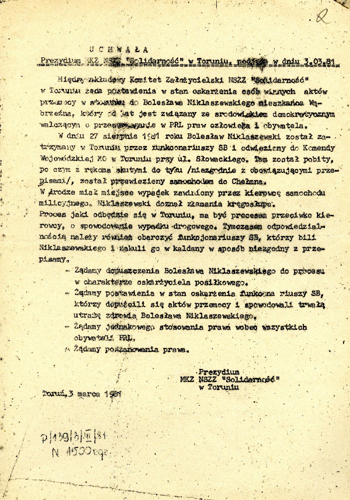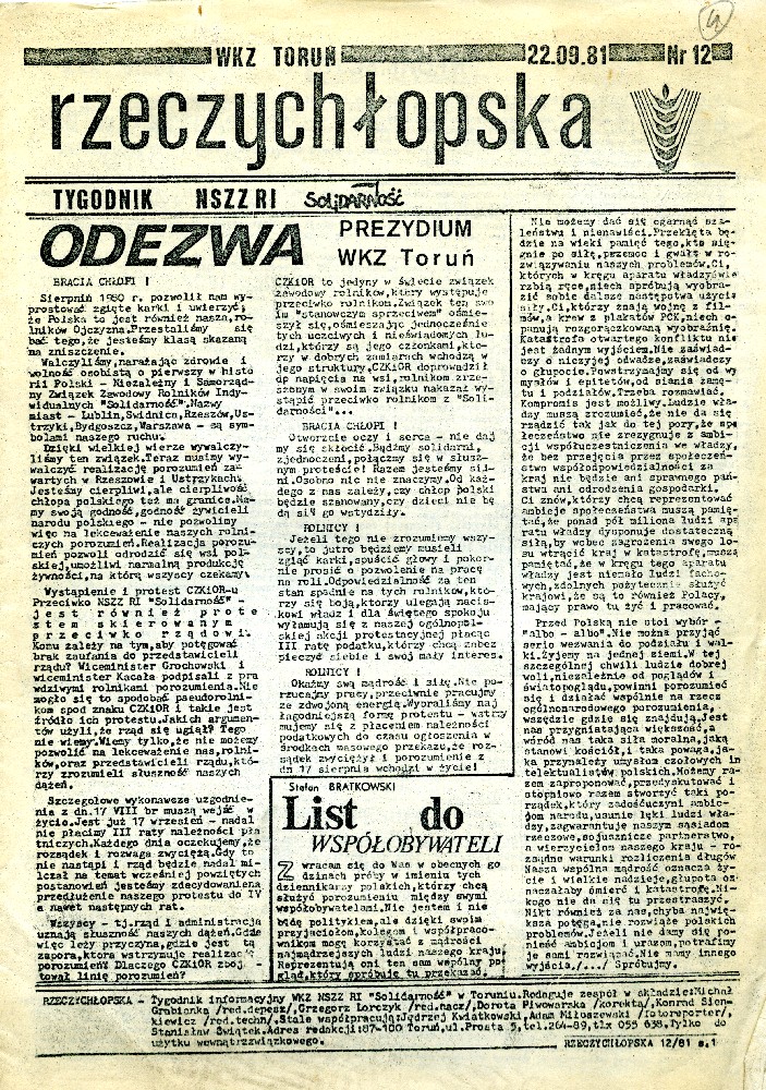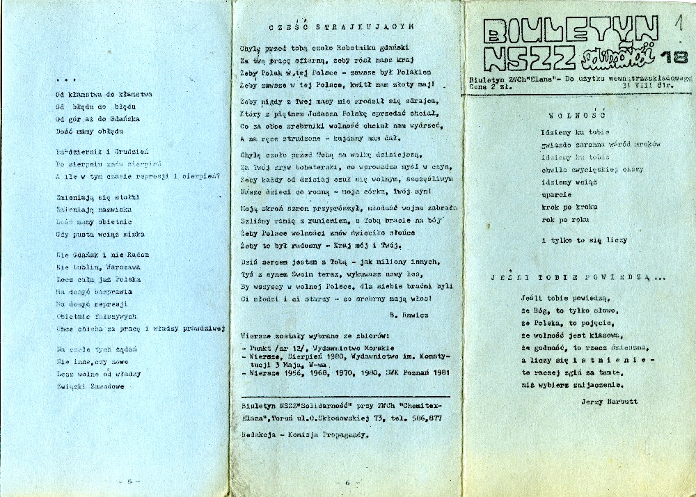 „Wolne Słowo” – Biuletyn Informacyjny NSZZ „Solidarność” nr 42 Odezwa Ogólnouczelnianego Komitetu Strajkowego Uniwersytetu Mikołaja Kopernika w Toruniu z 28.03.1981 r. „Solidarność” UMK – Biuletyn Informacyjno – Publicystyczny /karta tytułowa/ Biuletyn NSZZ „Solidarność” ZWCh „Elana” w Toruniu „Rota” dwutygodnik NSZZ „Solidarność” w Toruniu nr 1 /karta tytułowa/ „Rota” dwutygodnik NSZZ „Solidarność” w Toruniu nr 2 /karta tytułowa/ „Rzeczy Chłopska” – tygodnik NSZZ RI „Solidarność” nr 11 „Rzeczy Chłopska” – tygodnik NSZZ RI „Solidarność” nr 12 Biuletyn NSZZ „Solidarność” ZWCh „ELANA” w Toruniu z 20.01.1981 r. „Immunitet” –Niezależny Biuletyn Studencki nr 1 UMK w Toruniu Uchwała Prezydium MKZ NSZZ „Solidarność” w Toruniu z 3 marca 1981 r. „Motor Odnowy” Serwis Informacyjny NSZZ ‘Solidarność” POLMOZBYT Odezwa Zarządu Uczelnianego NZS UMK w Toruniu Oświadczenie Zarządu Uczelnianego NZS UMK w Toruniu z dnia 22 marca 1981 r. Informacja dla rolników zakładających „Solidarność Chłopską” Oświadczenie Zarządu Uczelnianego NZS UMK w Toruniu z dnia 22 marca 1981 r. Odezwa do rolników Odezwa Toruńskiego Komitetu Obrony Więzionych za Przekonania Wywiad z Janem Rulewskim z 22.03.1981 r. Komunikat MKZ NZSS „Solidarność” o wydarzeniach w Bydgoszczy w dniu 19.03.1981 r. Uchwała KKP z 20 marca 1981 r. „Immunitet” –Niezależny Biuletyn Studencki nr 11 UMK w Toruniu Uchwała w sprawie dostępu do środków masowego przekazu z 14.08.1981 r. Serwis Toruńskiej Agencji „Solidarności” z 18.11.1981 r. Komunikat MKZ NSZZ „Solidarność” w sprawie 5 dniowego tygodnia pracy "Immunitet” –Niezależny Biuletyn Studencki UMK w Toruniu wyd. nadzwyczajne 11.11.1980 r. #1 "Immunitet” –Niezależny Biuletyn Studencki UMK w Toruniu wyd. nadzwyczajne 11.11.1980 r. #2 "Immunitet” –Niezależny Biuletyn Studencki UMK w Toruniu wyd. nadzwyczajne 11.11.1980 r. #3 "Immunitet” –Niezależny Biuletyn Studencki UMK w Toruniu wyd. nadzwyczajne 11.11.1980 r. #4 "Immunitet” –Niezależny Biuletyn Studencki UMK w Toruniu wyd. nadzwyczajne 11.11.1980 r. #5 "Immunitet” –Niezależny Biuletyn Studencki UMK w Toruniu wyd. nadzwyczajne 11.11.1980 r. #6 "Immunitet” –Niezależny Biuletyn Studencki UMK w Toruniu wyd. nadzwyczajne 11.11.1980 r. #7 "Immunitet” –Niezależny Biuletyn Studencki UMK w Toruniu wyd. nadzwyczajne 11.11.1980 r. #8 "Immunitet” –Niezależny Biuletyn Studencki UMK w Toruniu wyd. nadzwyczajne 11.11.1980 r. #9 "Immunitet” –Niezależny Biuletyn Studencki UMK w Toruniu wyd. nadzwyczajne 11.11.1980 r. #10 "Immunitet” –Niezależny Biuletyn Studencki UMK w Toruniu wyd. nadzwyczajne 11.11.1980 r. #11 Komunikat MKZ NSZZ „Solidarność w Toruniu Projekt Uchwały MKZ NSZZ „Solidarność” z 28.04.1981 r. Pismo NSZZ „Solidarność” przy ZWCh „ELANA” w sprawie zdobywania dodatkowych zawodów. Uchwała Rady Wydziału Prawa i Administracji UMK z 24 marca 1981 r. #1 Uchwała Rady Wydziału Prawa i Administracji UMK z 24 marca 1981 r. #2 Uchwała Rady Wydziału Prawa i Administracji UMK z 24 marca 1981 r. #3 Uchwała Rady Wydziału Prawa i Administracji UMK z 24 marca 1981 r. #4 Pismo w sprawie rozpoczęcia akcji strajkowej w Wojewódzkim Przedsiębiorstwie Energetyki Cieplnej Rezolucja MKS w Toruniu z dnia 27.03.1981 r. Uchwała NSZZ „Solidarność” przy Sądzie Rejonowym w Toruniu 24.03.1981 r. Informacja o stanie gotowości strajkowej w Toruńskich Zakładach Urządzeń Okrętowych „Towimor” 20.03.1981 r. Uchwała NSZZ „Solidarność” przy Zakładach „METALCHEM” Rezolucja Pracowników i studentów Instytutu Fizyki UMK 20.03.1981 r. Uchwała NSZZ „Solidarność” przy Zakładach „Towimor” 21.03.1981 r. Rezolucja studentów UMK Rezolucja KZ PZPR przy Zakładach „Towimor” 23.03.1981 r. Oświadczenie Komitetu Porozumiewawczego Stowarzyszeń Naukowych i Twórczych 22.03.1981 r. Uchwała KZ NSZZ „Solidarność ”przy ZWCh „ELANA” 20.03.1981 r. Serwis Informacyjny NSZZ „Solidarność” w Toruniu - teleksy