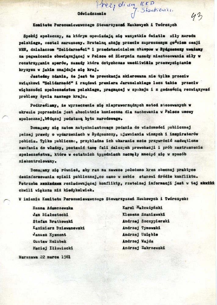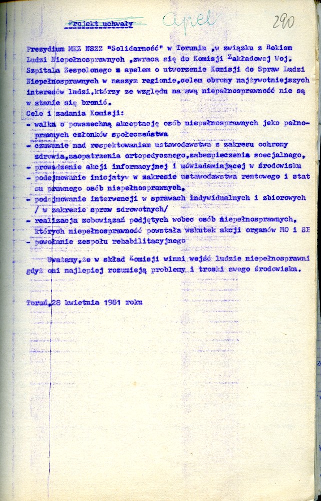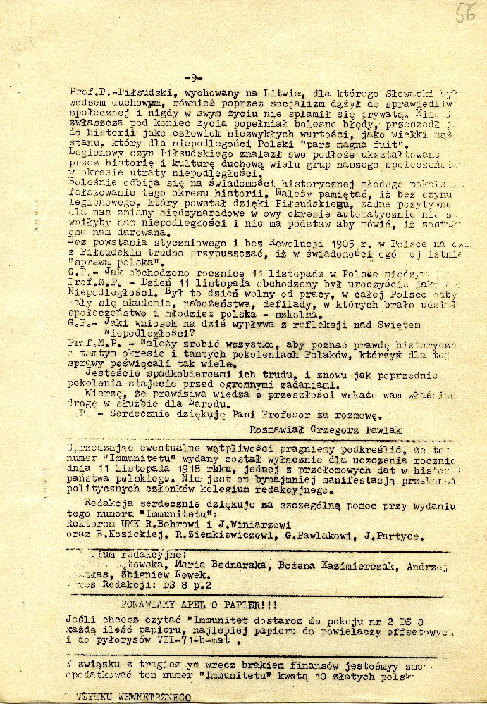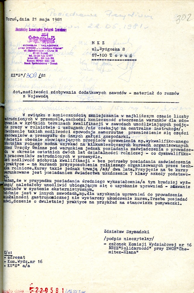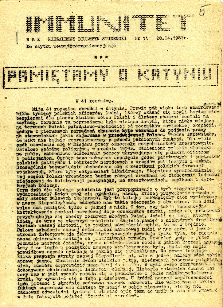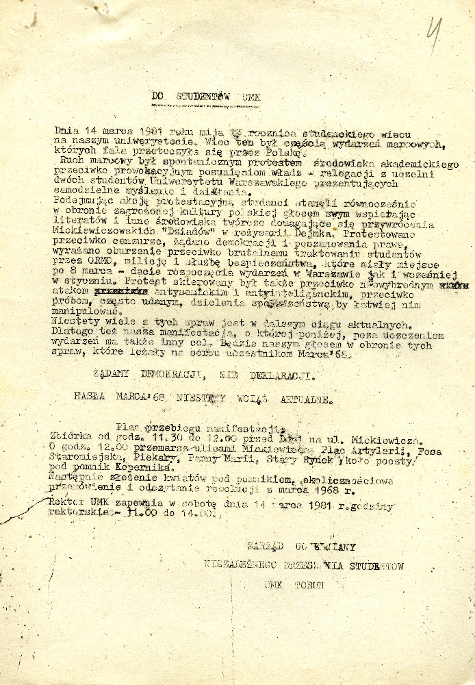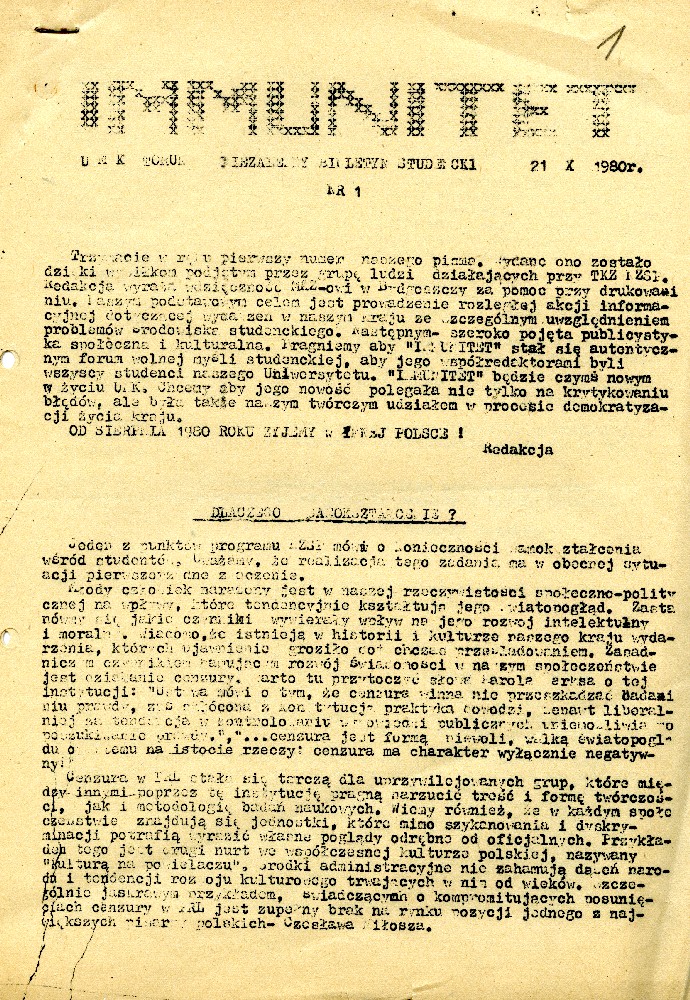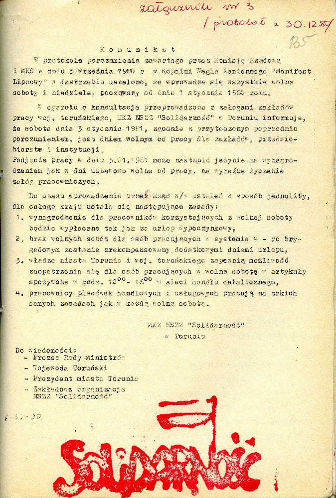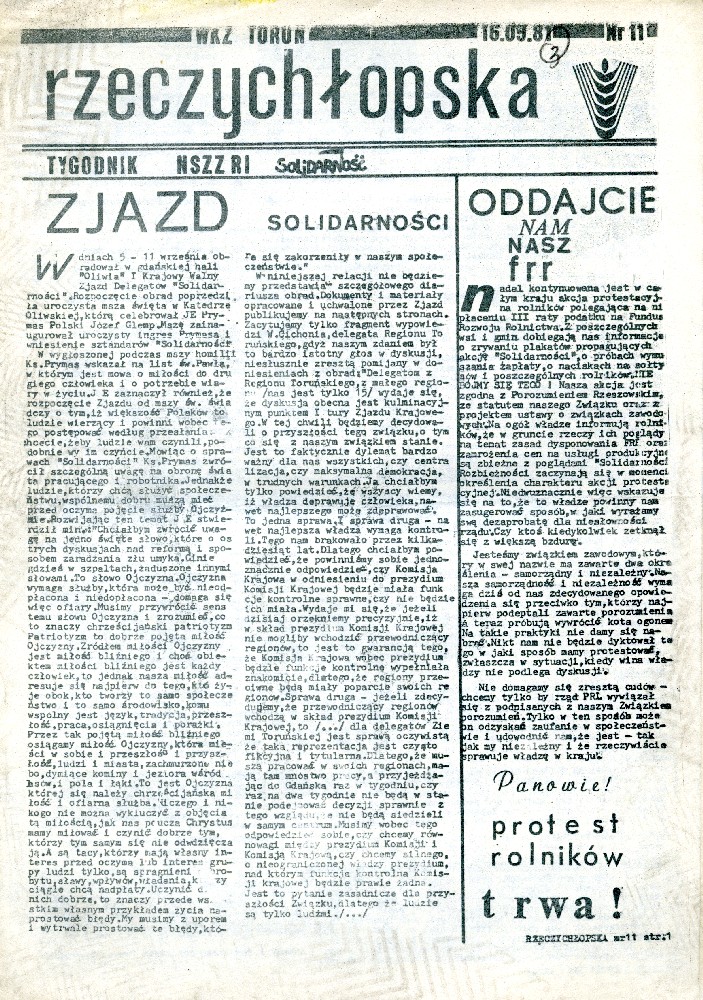 „Wolne Słowo” – Biuletyn Informacyjny NSZZ „Solidarność” nr 42 Odezwa Ogólnouczelnianego Komitetu Strajkowego Uniwersytetu Mikołaja Kopernika w Toruniu z 28.03.1981 r. „Solidarność” UMK – Biuletyn Informacyjno – Publicystyczny /karta tytułowa/ Biuletyn NSZZ „Solidarność” ZWCh „Elana” w Toruniu „Rota” dwutygodnik NSZZ „Solidarność” w Toruniu nr 1 /karta tytułowa/ „Rota” dwutygodnik NSZZ „Solidarność” w Toruniu nr 2 /karta tytułowa/ „Rzeczy Chłopska” – tygodnik NSZZ RI „Solidarność” nr 11 „Rzeczy Chłopska” – tygodnik NSZZ RI „Solidarność” nr 12 Biuletyn NSZZ „Solidarność” ZWCh „ELANA” w Toruniu z 20.01.1981 r. „Immunitet” –Niezależny Biuletyn Studencki nr 1 UMK w Toruniu Uchwała Prezydium MKZ NSZZ „Solidarność” w Toruniu z 3 marca 1981 r. „Motor Odnowy” Serwis Informacyjny NSZZ ‘Solidarność” POLMOZBYT Odezwa Zarządu Uczelnianego NZS UMK w Toruniu Oświadczenie Zarządu Uczelnianego NZS UMK w Toruniu z dnia 22 marca 1981 r. Informacja dla rolników zakładających „Solidarność Chłopską” Oświadczenie Zarządu Uczelnianego NZS UMK w Toruniu z dnia 22 marca 1981 r. Odezwa do rolników Odezwa Toruńskiego Komitetu Obrony Więzionych za Przekonania Wywiad z Janem Rulewskim z 22.03.1981 r. Komunikat MKZ NZSS „Solidarność” o wydarzeniach w Bydgoszczy w dniu 19.03.1981 r. Uchwała KKP z 20 marca 1981 r. „Immunitet” –Niezależny Biuletyn Studencki nr 11 UMK w Toruniu Uchwała w sprawie dostępu do środków masowego przekazu z 14.08.1981 r. Serwis Toruńskiej Agencji „Solidarności” z 18.11.1981 r. Komunikat MKZ NSZZ „Solidarność” w sprawie 5 dniowego tygodnia pracy "Immunitet” –Niezależny Biuletyn Studencki UMK w Toruniu wyd. nadzwyczajne 11.11.1980 r. #1 "Immunitet” –Niezależny Biuletyn Studencki UMK w Toruniu wyd. nadzwyczajne 11.11.1980 r. #2 "Immunitet” –Niezależny Biuletyn Studencki UMK w Toruniu wyd. nadzwyczajne 11.11.1980 r. #3 "Immunitet” –Niezależny Biuletyn Studencki UMK w Toruniu wyd. nadzwyczajne 11.11.1980 r. #4 "Immunitet” –Niezależny Biuletyn Studencki UMK w Toruniu wyd. nadzwyczajne 11.11.1980 r. #5 "Immunitet” –Niezależny Biuletyn Studencki UMK w Toruniu wyd. nadzwyczajne 11.11.1980 r. #6 "Immunitet” –Niezależny Biuletyn Studencki UMK w Toruniu wyd. nadzwyczajne 11.11.1980 r. #7 "Immunitet” –Niezależny Biuletyn Studencki UMK w Toruniu wyd. nadzwyczajne 11.11.1980 r. #8 "Immunitet” –Niezależny Biuletyn Studencki UMK w Toruniu wyd. nadzwyczajne 11.11.1980 r. #9 "Immunitet” –Niezależny Biuletyn Studencki UMK w Toruniu wyd. nadzwyczajne 11.11.1980 r. #10 "Immunitet” –Niezależny Biuletyn Studencki UMK w Toruniu wyd. nadzwyczajne 11.11.1980 r. #11 Komunikat MKZ NSZZ „Solidarność w Toruniu Projekt Uchwały MKZ NSZZ „Solidarność” z 28.04.1981 r. Pismo NSZZ „Solidarność” przy ZWCh „ELANA” w sprawie zdobywania dodatkowych zawodów. Uchwała Rady Wydziału Prawa i Administracji UMK z 24 marca 1981 r. #1 Uchwała Rady Wydziału Prawa i Administracji UMK z 24 marca 1981 r. #2 Uchwała Rady Wydziału Prawa i Administracji UMK z 24 marca 1981 r. #3 Uchwała Rady Wydziału Prawa i Administracji UMK z 24 marca 1981 r. #4 Pismo w sprawie rozpoczęcia akcji strajkowej w Wojewódzkim Przedsiębiorstwie Energetyki Cieplnej Rezolucja MKS w Toruniu z dnia 27.03.1981 r. Uchwała NSZZ „Solidarność” przy Sądzie Rejonowym w Toruniu 24.03.1981 r. Informacja o stanie gotowości strajkowej w Toruńskich Zakładach Urządzeń Okrętowych „Towimor” 20.03.1981 r. Uchwała NSZZ „Solidarność” przy Zakładach „METALCHEM” Rezolucja Pracowników i studentów Instytutu Fizyki UMK 20.03.1981 r. Uchwała NSZZ „Solidarność” przy Zakładach „Towimor” 21.03.1981 r. Rezolucja studentów UMK Rezolucja KZ PZPR przy Zakładach „Towimor” 23.03.1981 r. Oświadczenie Komitetu Porozumiewawczego Stowarzyszeń Naukowych i Twórczych 22.03.1981 r. Uchwała KZ NSZZ „Solidarność ”przy ZWCh „ELANA” 20.03.1981 r. Serwis Informacyjny NSZZ „Solidarność” w Toruniu - teleksy