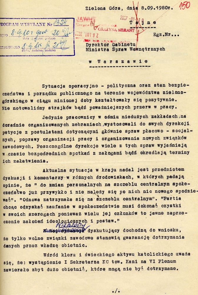 Fotografie dokumentów SB do władz adm – polit. Województwa Zielonogórskiego dotyczących sytuacji społeczno – politycznej w okresie letnim 1980 roku.