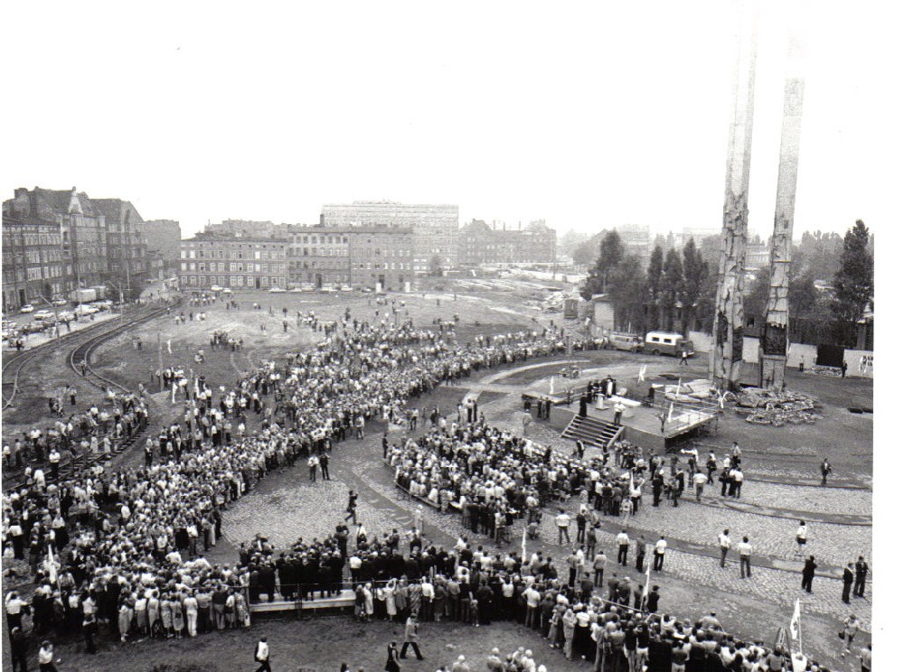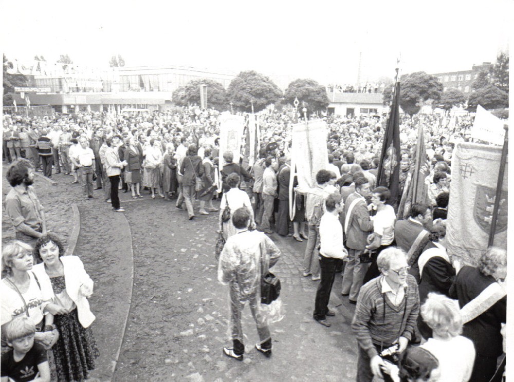 Materiały przekazane przez Pana Edwarda Müllera, spuścizna. 1981 uroczystości pod Pomnikiem Poległych Stoczniowców - Gdańsk oraz zdjęcia z murów Stoczni. Wykonał fotograf Jerzy Dorosz - Słupsk