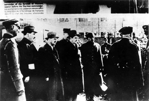 Budowa umocnień polowych w Warszawie #1 Budowa umocnień polowych w Warszawie #2 Obrona przeciwlotnicza Warszawy Warszawa we wrześniu '39 #1 Warszawa we wrześniu '39 #2 Warszawa we wrześniu '39 #3 Warszawa we wrześniu '39 #4 Warszawa we wrześniu '39 #5 Bombardowanie Warszawy Prezydent m. st. Warszawy - Stefan Starzyński Samoloty niemieckie nad Warszawą Samoloty niemieckie bombardujące Warszawę Ofiara nalotów niemieckich Płonąca Warszawa #1 Płonąca Warszawa #2 Płonąca Warszawa #3 Płonąca Warszawa #4 Żołnierz polski Zniszczenia Warszawy #1 Zniszczenia Warszawy #2 Zniszczenia Warszawy #3 Rozmowy kapitulacyjne #1 Rozmowy kapitulacyjne #2 Delegacja polska podczas rozmów kapitulacyjnych w Warszawie. IV z lewej stoi prezydent m. st. Warszawy - Stefan Starzyński Wojska niemieckie w Warszawie #1 Wojska niemieckie w Warszawie #2 Wojska niemieckie w Warszawie #3 Wojska niemieckie w Warszawie #4 Zakładnicy w Pałacu Blanka w W-wie oddani do dyspozycji władz niemieckich na czas uroczystej defilady hitlerowskiej w W-wie w dniu 5.10.1939 r.