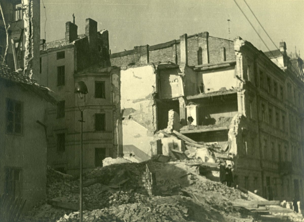 Ruiny zniszczonych kamienic przy ul. Franciszkańskiej (prawdopodobnie po północnej stronie między ul. Nalewki i ul. Bonifraterską). Kamienice między placem Krasińskich i ul. Nowiniarską (pl. Krasińskich 6/8/10 - ul. Nowiniarska 1/3/5) - widok części północnej z placu w kierunku wschodnim. Budynki przy ul. Wierzbowej - widok z placu Teatralnego. Od prawej: fragment kamienicy Petiscusa (ul. Wierzbowa róg Senatorskiej), dalej zburzona kamienica Dmuszewskiego. Zniszczona zabudowa północnej pierzei placu Piłsudskiego - widok w kierunku północnym. Widoczne ruiny spalonych kamienic przy ul. Wierzbowej 2 i ul. Ossolińskich 8. Wypalone domy przy ul. Królewskiej. Spalone tylne pawilony Szpitala Św. Ducha przy ul. Elektoralnej 12. Zniszczona kamienica przy ul. Rynkowej (współcześnie rejon Parku Mirowskiego). Ruiny zniszczonych budynków przy obecnie nieistniejącej ul. Wielkiej (współcześnie okolice placu Defilad). Okolice Dworca Głównego. Na pierwszym planie zniszczony budynek tzw. „Nowej Poczekalni” dawnego Dworca Wiedeńskiego, za nim tylna fasada Hotelu „Astoria”. W tle po lewej zabudowa wzdłuż ul. Chmielnej. Budynek Orbisu (Al. Jerozolimskie 33 róg ul. Marszałkowskiej 98) - widok w kierunku północnym. Po lewej w głębi kamienica Lothego (Al. Jerozolimskie 34/36 róg ul. Marszałkowskiej 100). Częściowo zburzony budynek przy ul. Emilii Plater. Ruiny zniszczonych budynków na rogu ul. Marszałkowskiej i Wspólnej - widok pod kątem przez ulicę. Spalona kamienica hr. Ostrowskiego na rogu ul. Świętokrzyskiej i Mazowieckiej - widok z pl. Napoleona (obecnie pl. Powstańców Warszawy). Zniszczone domy po północnej stronie ul. Ordynackiej - widok prawdopodobnie z rogu ul. Kopernika. Na końcu tzw. Dom Miłosierdzia, w tle po prawej budynek Konserwatorium Muzycznego. Zniszczone budynki przy ul. Ordynackiej i Okólnik. Uszkodzone kamienice przy alei 3 Maja. Zniszczony budynek Szkoły Powszechnej przy ul. Szerokiej (obecnie ul. ks. Ignacego Kłopotowskiego) Zniszczone domy przy ul. Zamoyskiego. Ruiny domów przy ul. Wołomińskiej.